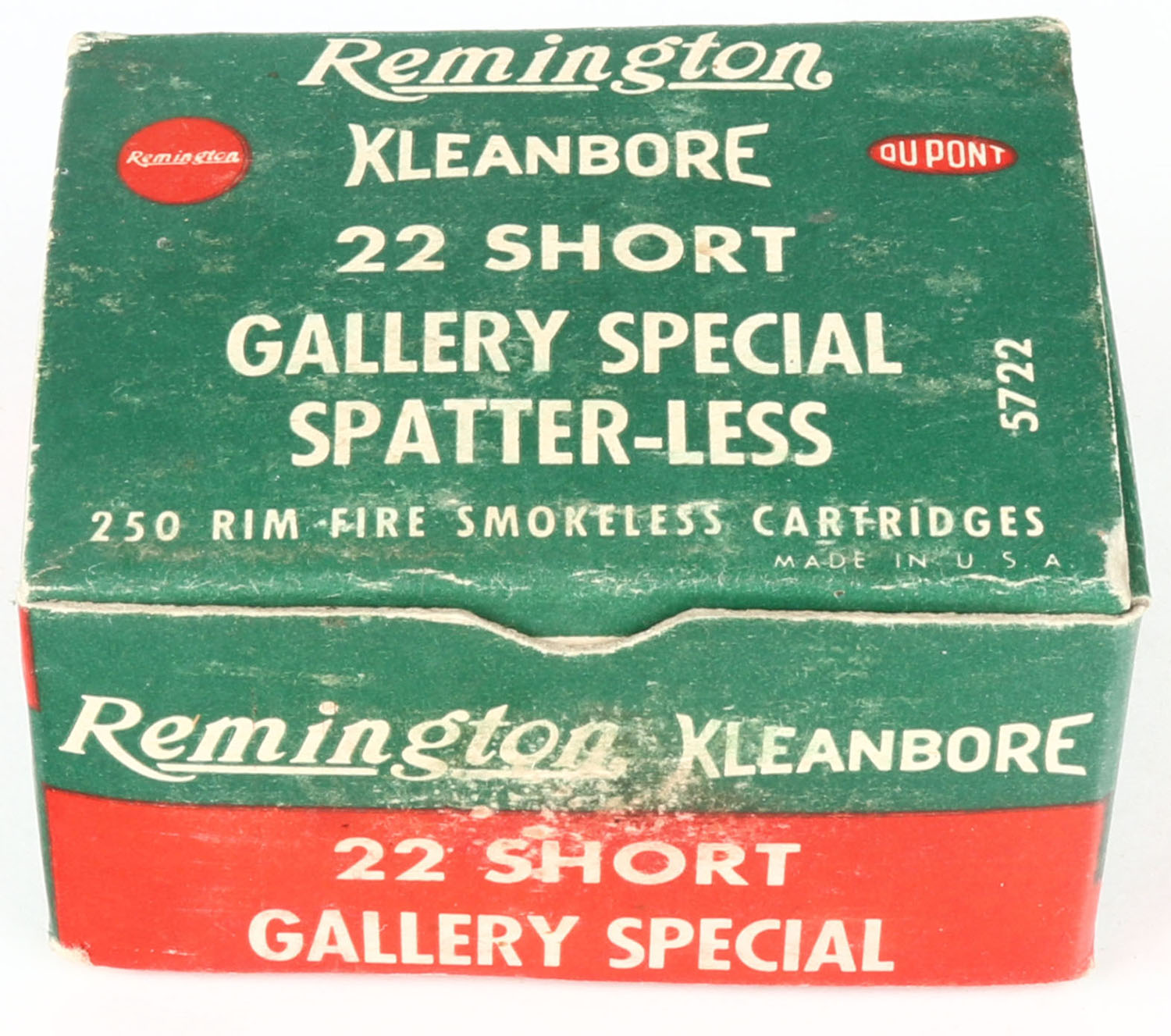 Remington, Gallery Special Spatter-Less, .22 Short, Full, 250rds. 1pc. Green red & white bulk box, box is solid with excellent color, some shelf wear, minor corner wear, very minor edge wear, top flap is solid, ammo is excellent. Grade: Very Good ++ - Value: 200 to 250