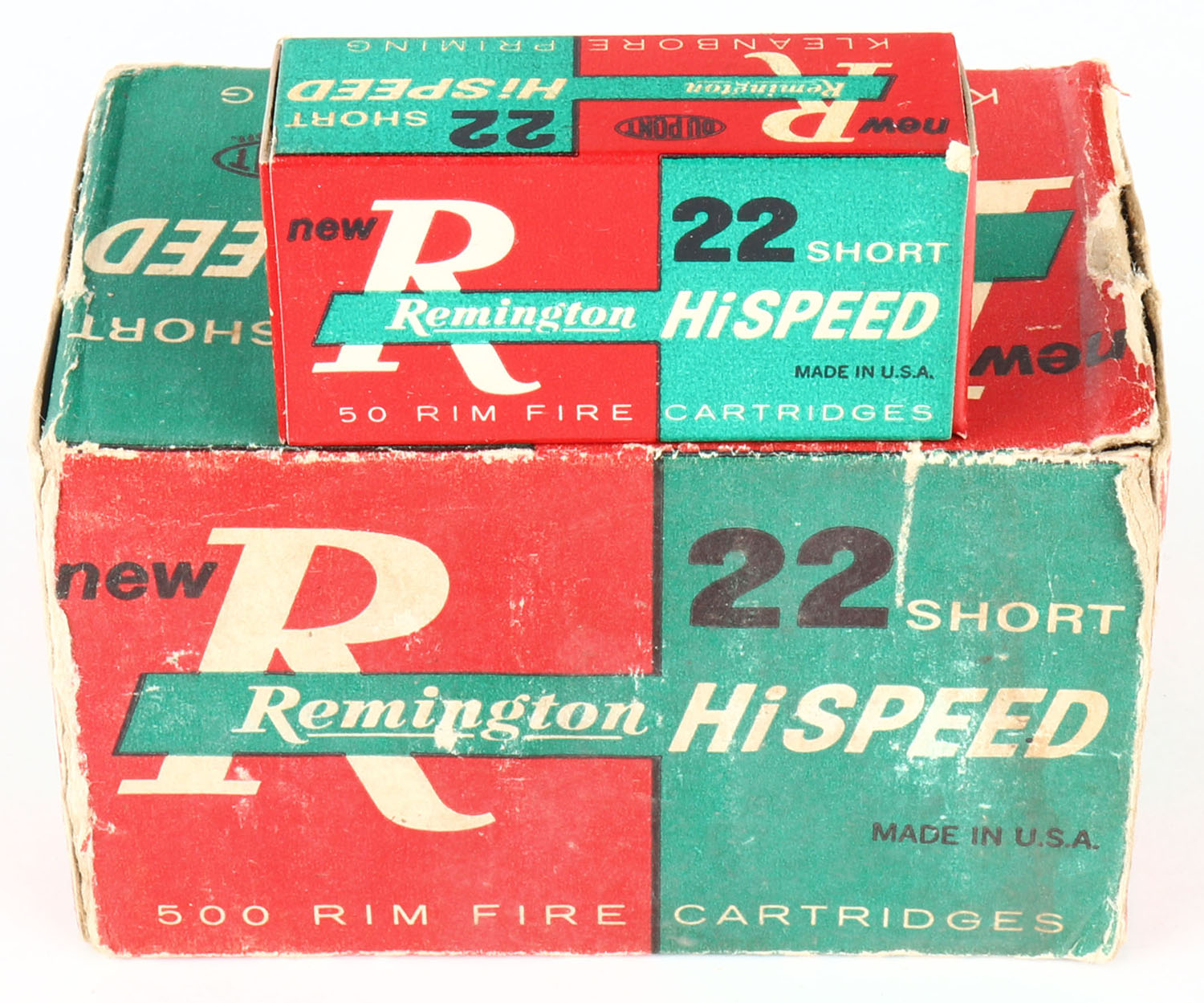 Remington, Hi-Speed, .22 Short, Kleanbore, Full, 500rds. 1pc. Red green & white brick, right end flap is torn, left end flap is torn & taped, very good color, some age soiling & shelf wear, corner wear, some edge wear, inside boxes are minty. Grade: Good + - Value: 80 to 120