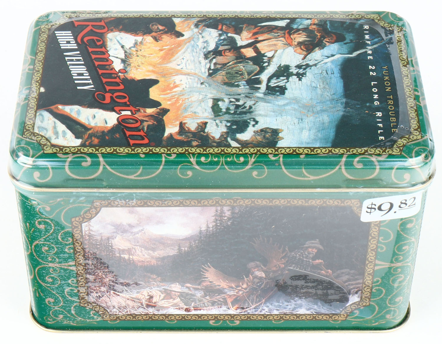 Remington, Limited Edition Collectors Tin, .22 Long Rifle, High Velocity, 1pc. FULL & SEALED, 400rds. Hinged tin features ''Yukon Trouble'' Classic Remington advertisement artwork. Grade: MINT - Value: 60 to 90