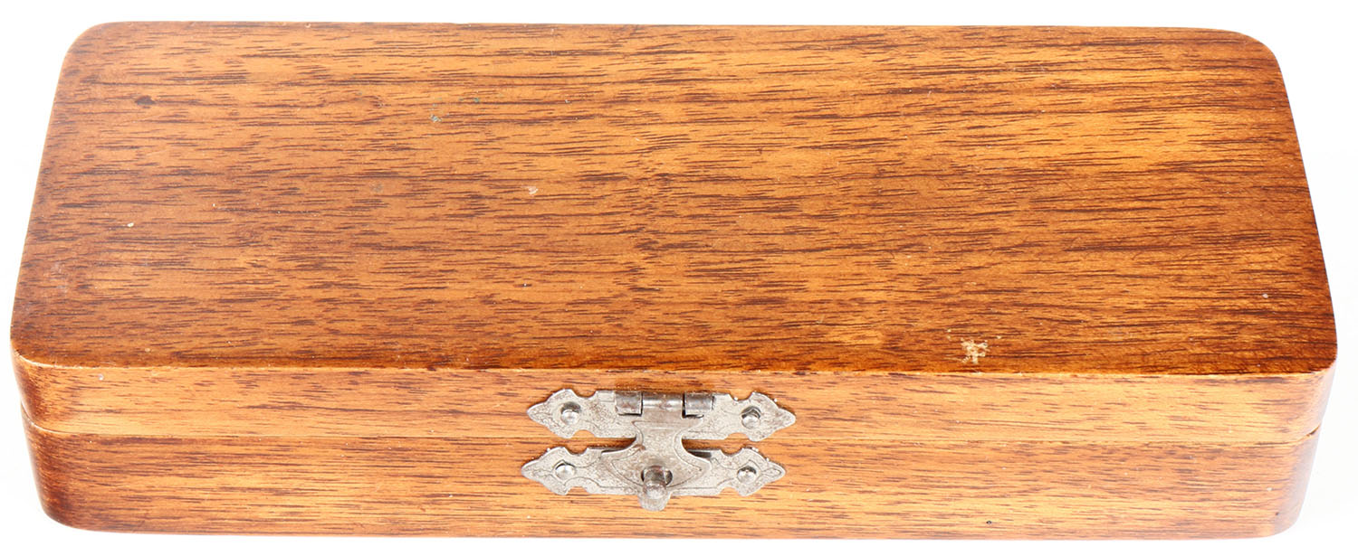 Badger Shooters Supply, Camp Perry Style box, very nice stained wood with brass latch, notches for 90 rounds & 50rd. .22 box. Grade: Excellent ++ - Value: 40 to 60