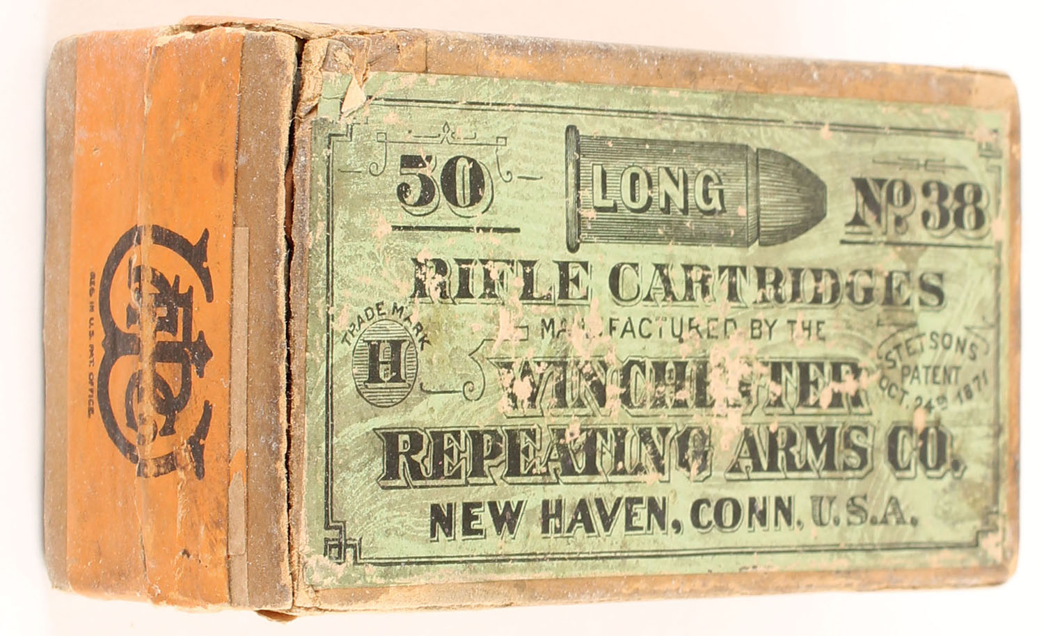 Winchester, Rifle Cartridges, .38 Long Rim Fire, Oct. 24 Patent Date, Full, 2pc. Buff box with green top & orange side sealing labels, with insert, seam splits to left edge & back left corner of lid, Very Good color, some age soiling & shelf wear, edge & corner wear, labels are intact, ammo is very good. Grade: Good + - Value: 30 to 45