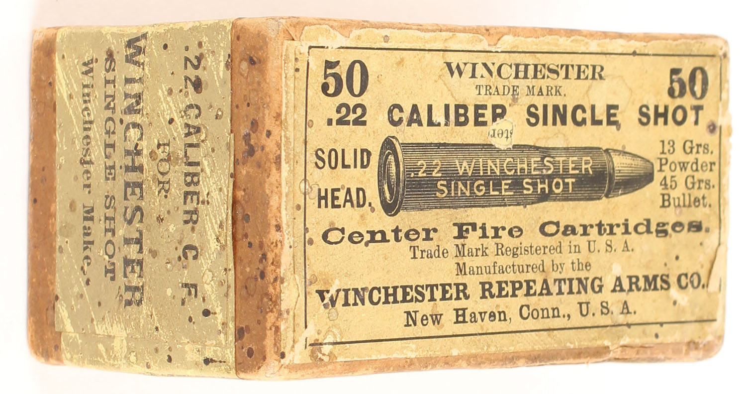 Winchester, Center Fire Cartridges, .22 Winchester Single Shot, 45 Grs. Solid Head, FULL & SEALED, 2pc. Buff box with green top & side sealing labels, box is solid with good to very good color, color fading, some age soiling & shelf wear, partial seam split to top front edge, some edge & corner wear, labels are intact. Grade: Very Good + - Value: 120 to 180