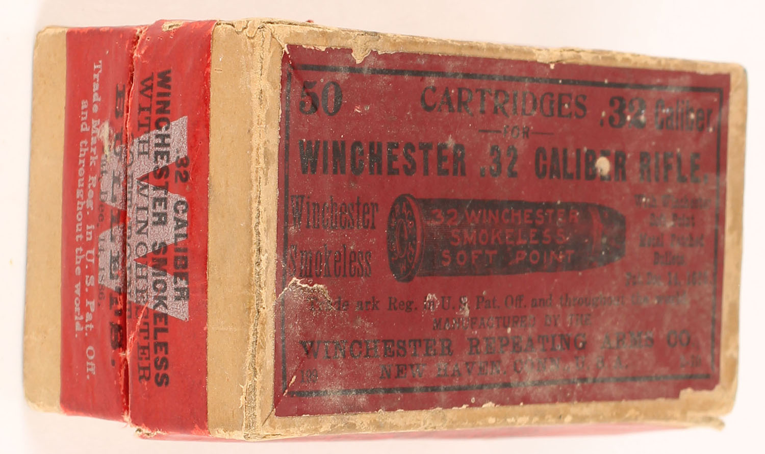 Winchester, Smokeless Cartridges, .32 Winchester, Metal Patched Bullets, Partial 37rds. 2pc. Buff box with red top & side sealing labels, box is solid with very good color, some age soiling, vertical seam split to front right corner of lid, some corner wear, minor edge wear, side sealing label is 95% intact, ammo is excellent. Grade: Very Good + - Value: 40 to 60