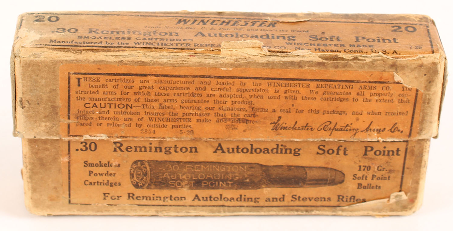 Winchester, Smokeless Cartridges, .30 Remington Autoloading, 170 Gr. Soft Point Bullets, Partial 19rds. correct, 2pc. Buff box with orange labels, box is solid with very good color, age soiling, edge & corner wear, labels are intact, ammo is good, many rounds have cracked necks. Grade: Very Good - Value: 50 to 75