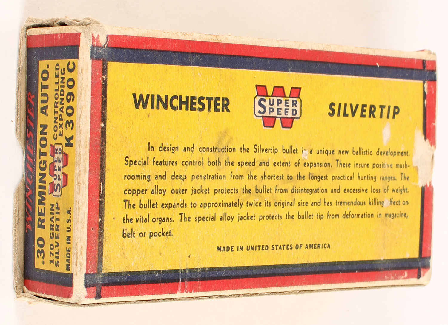 Winchester, Silvertip, .30 Remington Autoloading, 170 Grain Controlled Expanding Bullet, Full, 1pc. Yellow blue & red bear box, box is solid with excellent color, some shelf & corner wear, very minor edge wear, end flaps are solid, ammo is excellent. Grade: Excellent - Value: 80 to 120