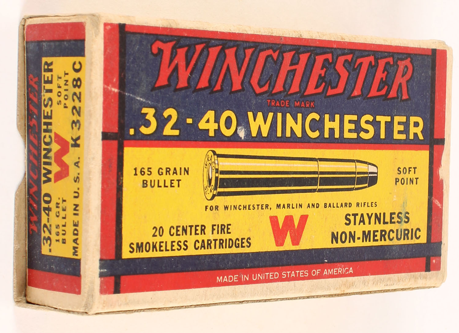 Winchester, Smokeless Cartridges, .32-40 Winchester, 165 Grain Soft Point Bullet, Full, 1pc. Yellow blue & red box, box is solid with excellent color, some corner wear, sticker on left end, very minor edge wear, end flaps are solid, ammo is excellent. Grade: Excellent - Value: 100 to 150