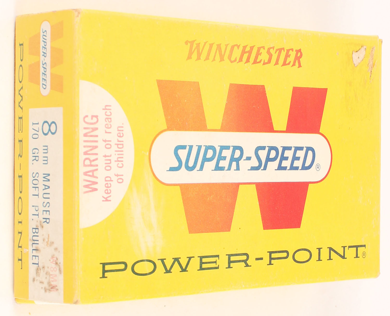 Winchester, Power-Point, 8mm Mauser, 170 Grain Soft Point Bullet, Full, 1pc. Yellow white & red box, box is solid with very good color, some color fading on top, sticker residue on top, very minor corner wear, edges are crisp, end flaps are solid, ammo is excellent. Grade: Excellent - Value: 20 to 30