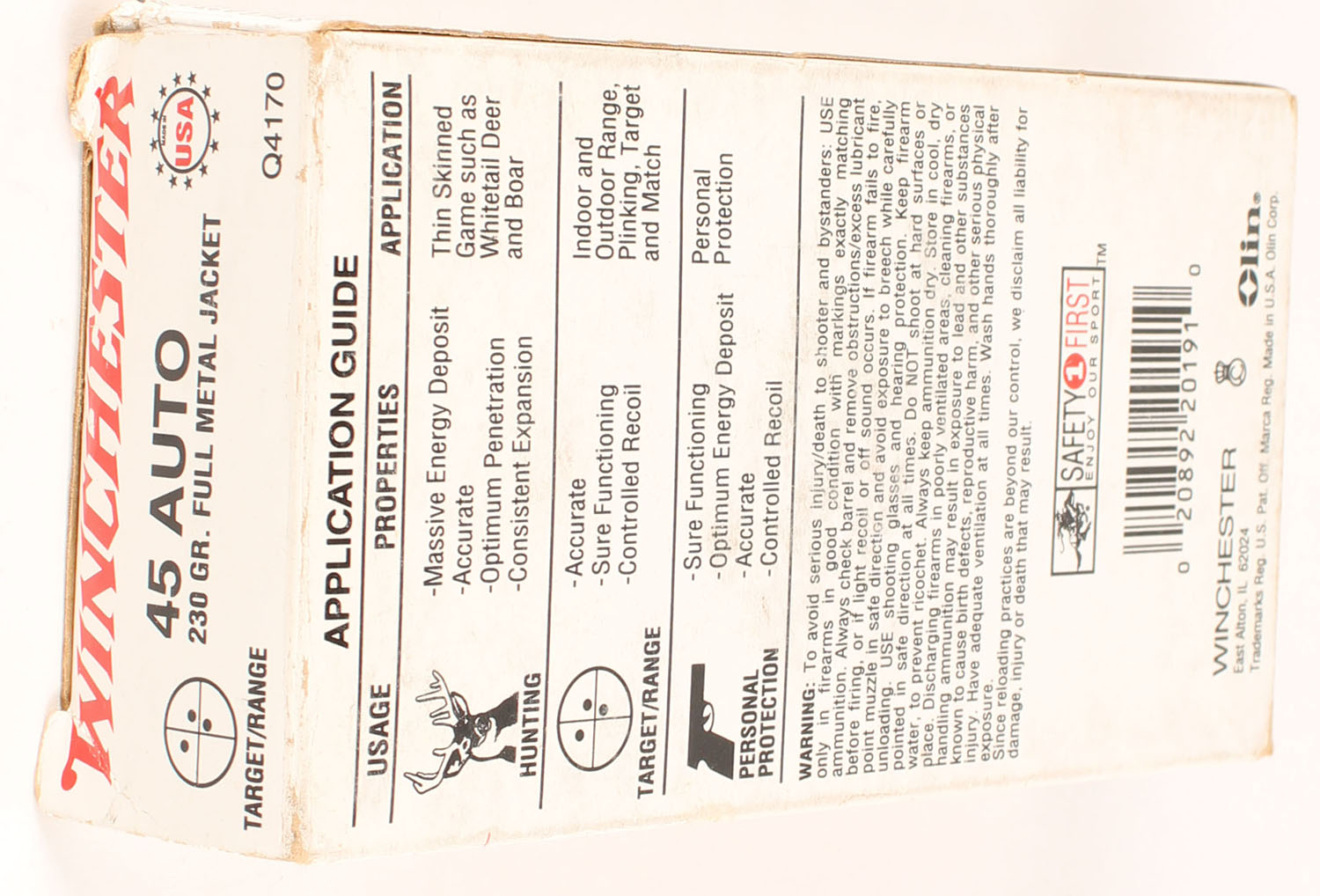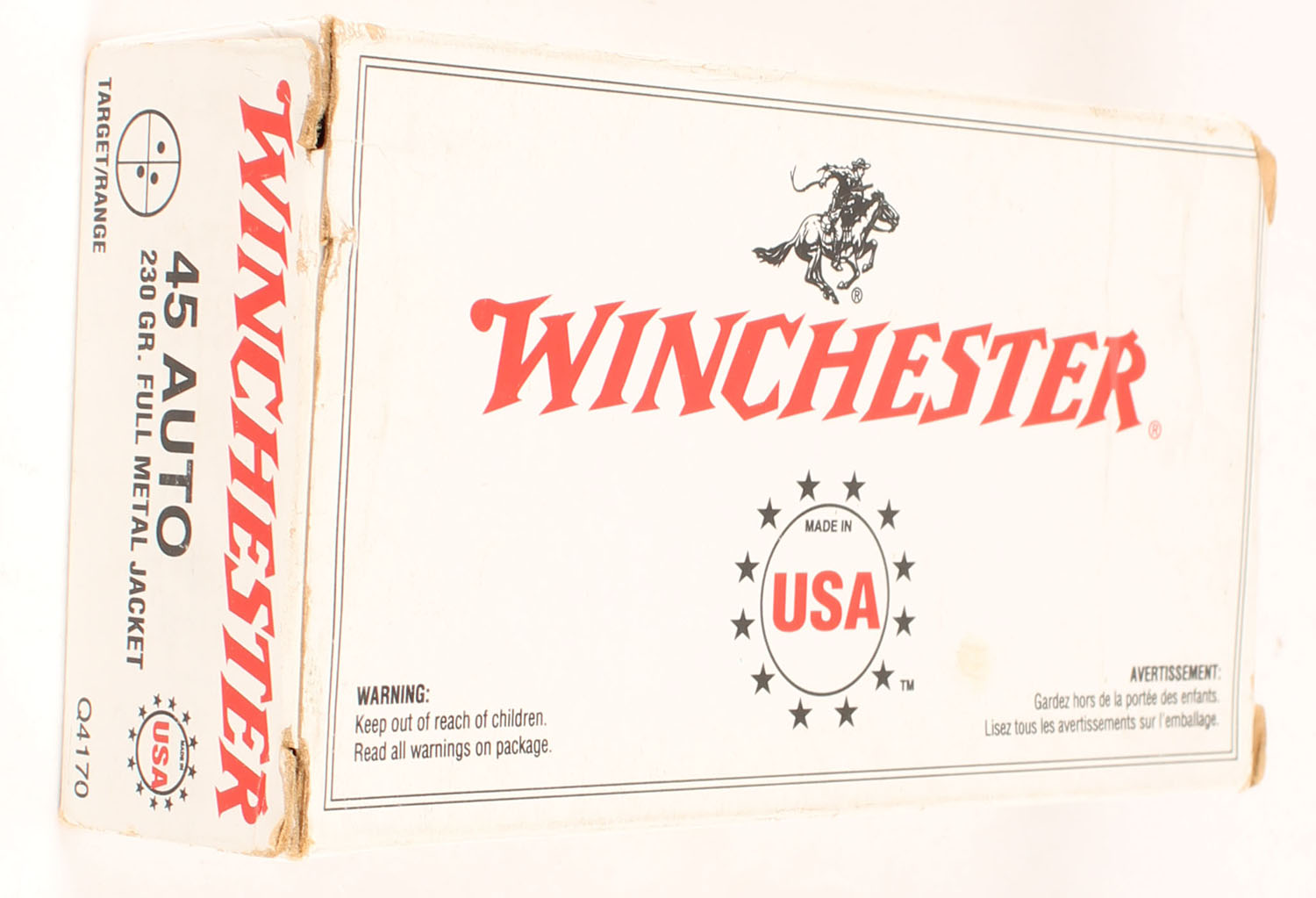 Winchester, USA, .45 Auto, 230 Grain Full Metal Jacket, Full, 1pc. White red & black box, box is solid with excellent color, very minor staining, minor corner wear, edges are crisp, end flaps are solid, ammo is minty. Grade: Excellent - Value: 16 to 24