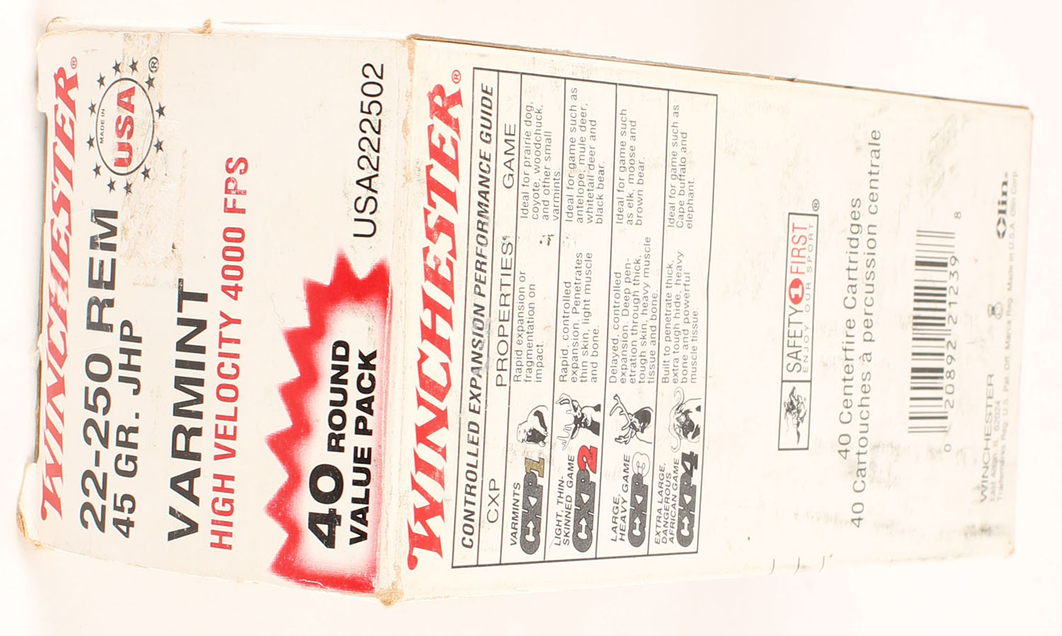 Winchester, USA, .22-250 Remington, 45 Grain Jacketed Hollow Point, High Velocity 4000 FPS, 40 Round Value Pack, Full, 1pc. White red & black box, box is solid with excellent color, top has been written on, some shelf & corner wear, end flaps are solid, ammo is very good to excellent. Grade: Very Good - Value: 40 to 60