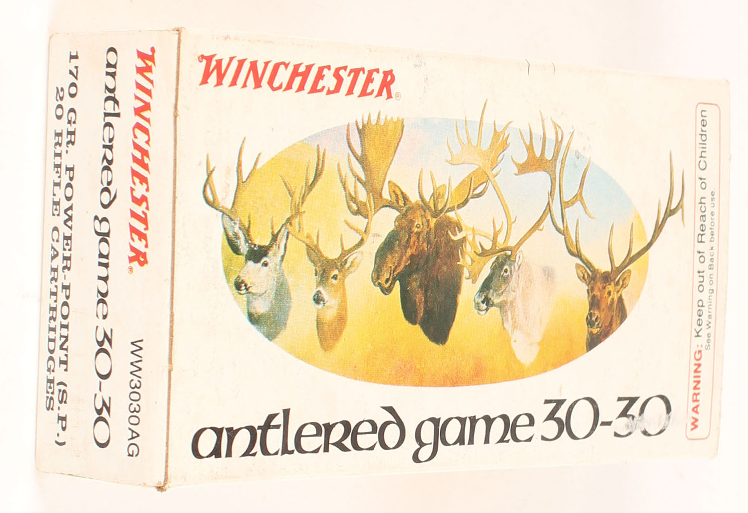 Winchester, antlered game, .30-30 Winchester, 170 Grain Power-Point, Partial 18rds. 1pc. Multi-colored box, box is solid with excellent color, some shelf wear, very minor corner wear, edges are mostly crisp, end flaps are solid, ammo is minty. Grade: Excellent - Value: 60 to 90