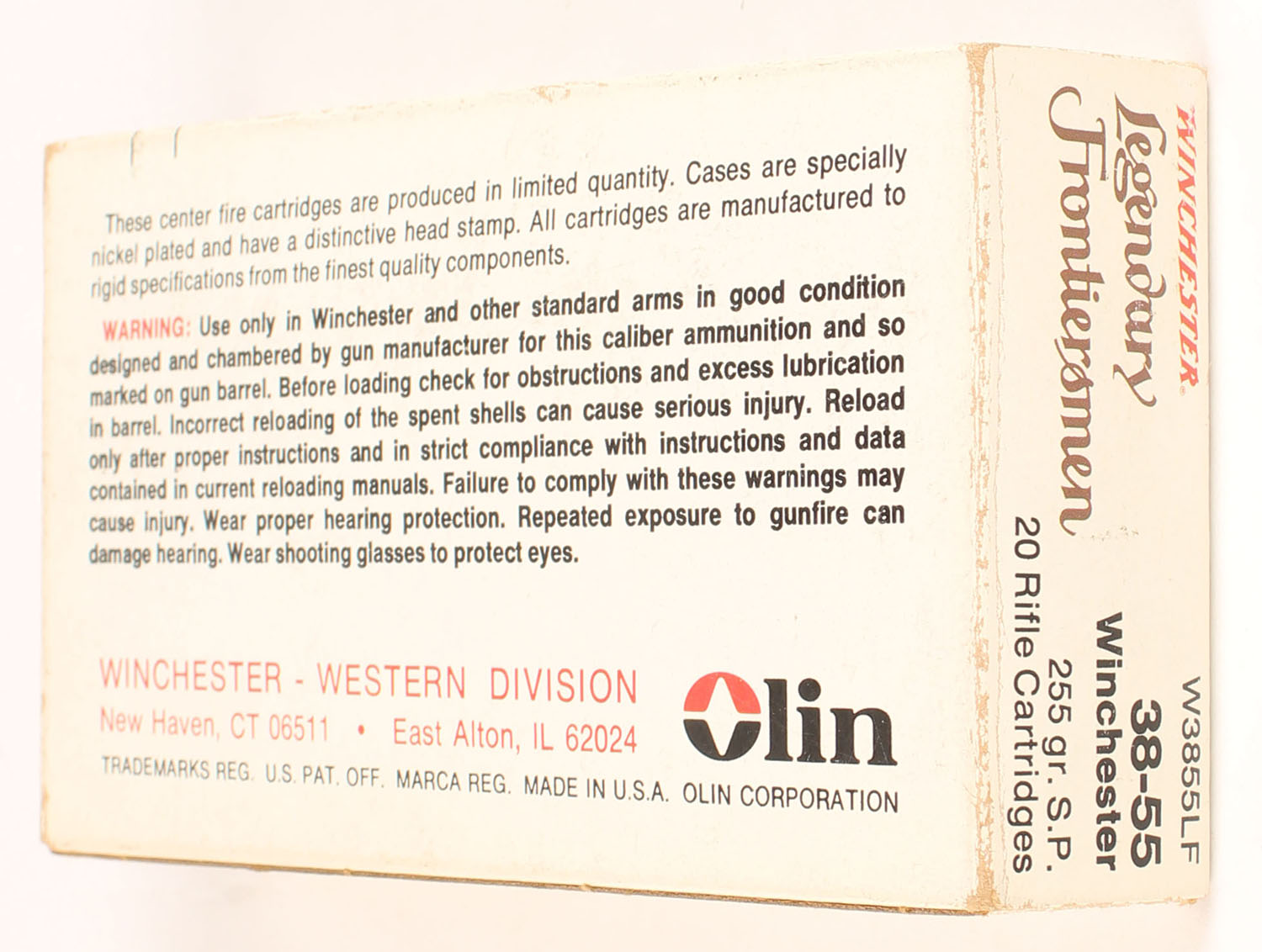 Winchester, Legendary Frontiersmen, .38-55 Winchester, 255 Grain Soft Point, Full, 1pc. Multi-colored box, box is solid with very good to excellent color, some edge & corner wear, end flaps are solid, ammo is excellent. Grade: Very Good + - Value: 50 to 75
