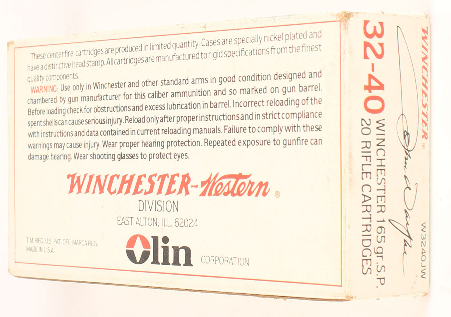 Winchester, John Wayne, .32-40 Winchester, 165 Grain Soft Point, Full, 1pc. White box featuring John Wayne, box is solid with excellent color, very minor age soiling, minor edge & corner wear, end flaps are solid, ammo is minty. Grade: Excellent - Value: 80 to 120
