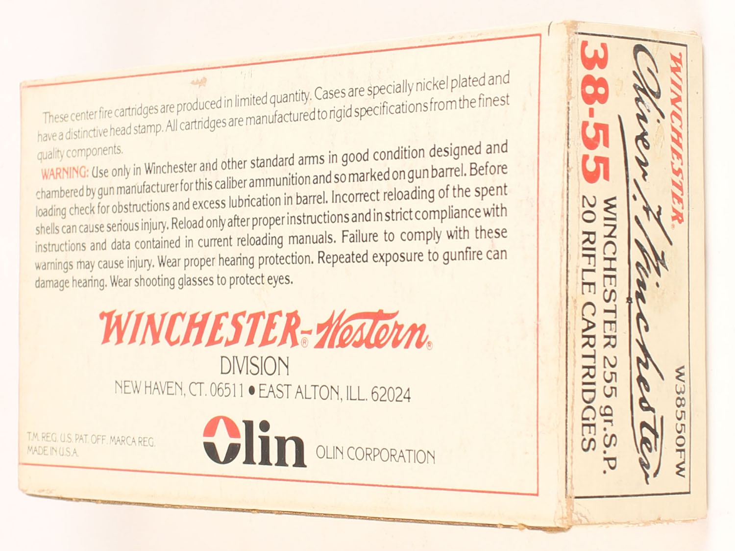 Winchester, Oliver F. Winchester, .38-55 Winchester, 255 Grain Soft Point, Full, 1pc. White box picturing Oliver Winchester, box is solid with excellent color, minor shelf wear, very minor corner wear, edges are crisp, end flaps are solid, ammo is minty. Grade: Excellent - Value: 50 to 75