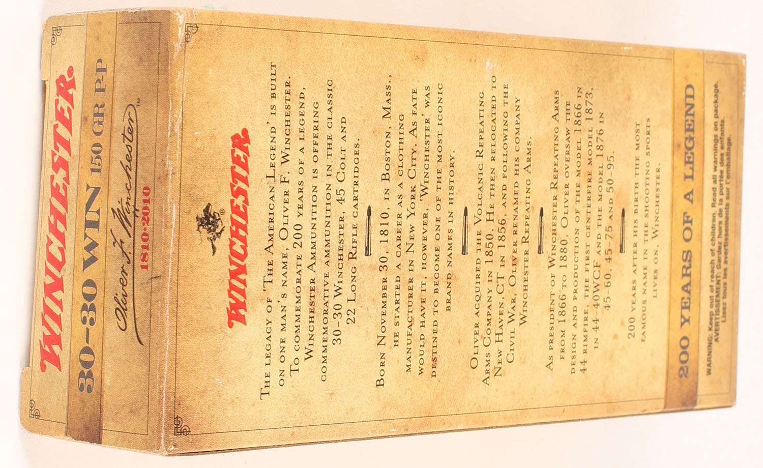 Winchester, Oliver F. Winchester 1810-2010, Commemorating 200 Years of a Legend, .30-30 Win. 150 Gr. Power-Point., Full, 1pc. Brown box featuring a portrait of Oliver Winchester, box is near mint with minty color, only very minor shelf wear, corners are mostly sharp, edges are crisp, end flaps are solid, ammo is minty. Grade: Excellent ++ - Value: 50 to 75