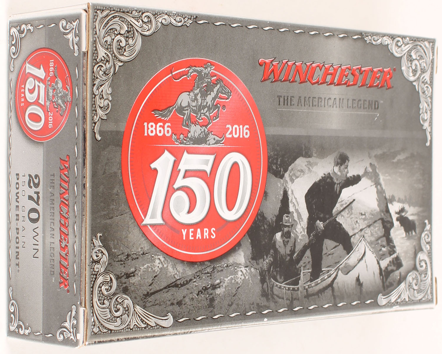 Winchester, The American Legend, 150 Year Commemorative box, .270 Winchester, 150 Grain Power-Point, Full, 1pc. Silver & red box, box is MINT with minty color, corners are sharp, edges are crisp, end flaps are solid, ammo is minty. Grade: MINT - Value: 70 to 100