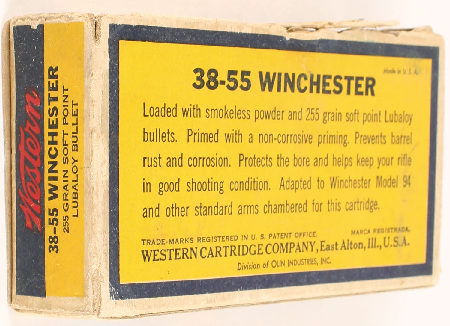 Western, Lubaloy Cartridges, .38-55 Winchester, 255 Grain Soft Point, Full, 1pc. Yellow blue & red bulls eye box, back side of box is completely torn off, factory seams have partially unadhered, very good color, minor age soiling, end flaps are solid, ammo is excellent. Grade: Fair ++ - Value: 40 to 60