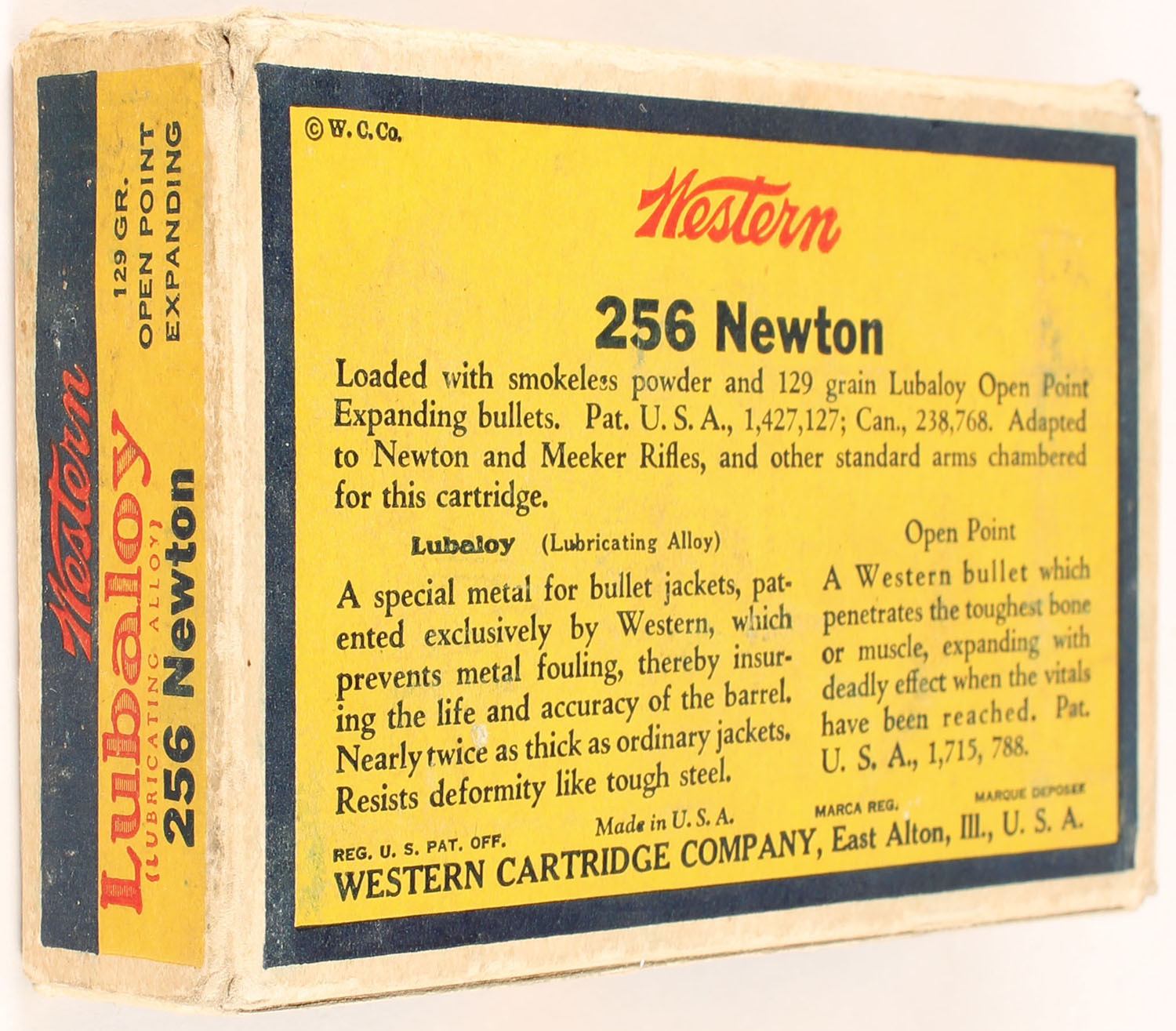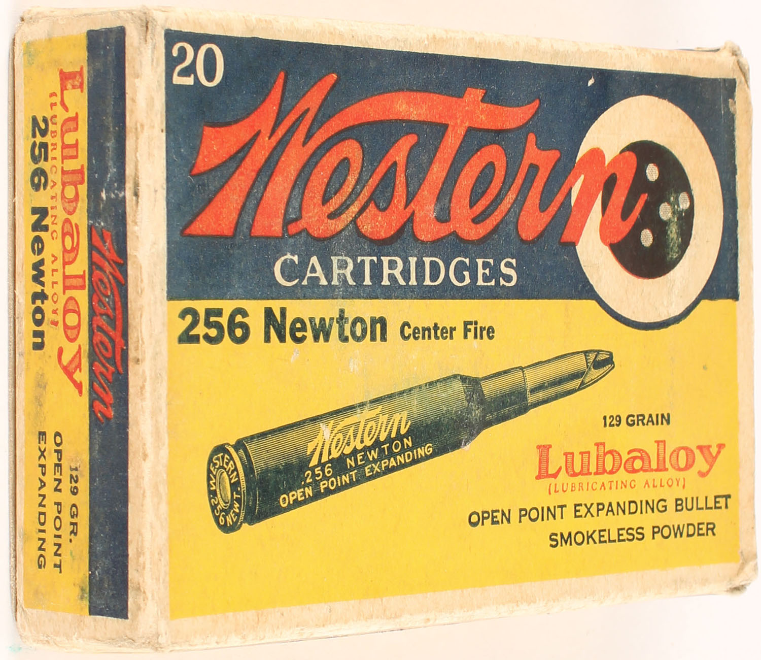 Western, Lubaloy Cartridges, .256 Newton, 129 Grain Open Point Expanding Bullet, Full, 1pc. Yellow blue & red bulls eye box, box is solid with very good color, minor age soiling & shelf wear, some corner wear, minor edge wear, end flaps are solid, ammo is excellent. Grade: Very Good ++ - Value: 120 to 160