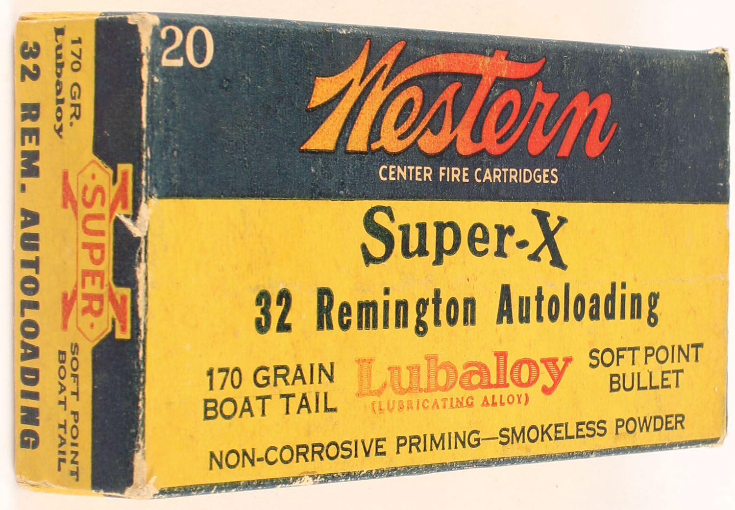 Western, Super-X, .32 Remington Autoloading, 170 Grain Boat Tail Soft Point Bullet, Full, 1pc. Yellow blue & red box, box is solid with very good color, minor age soiling & color fading, minor edge & corner wear, end flaps are solid, ammo is excellent. Grade: Very Good ++ - Value: 36 to 54