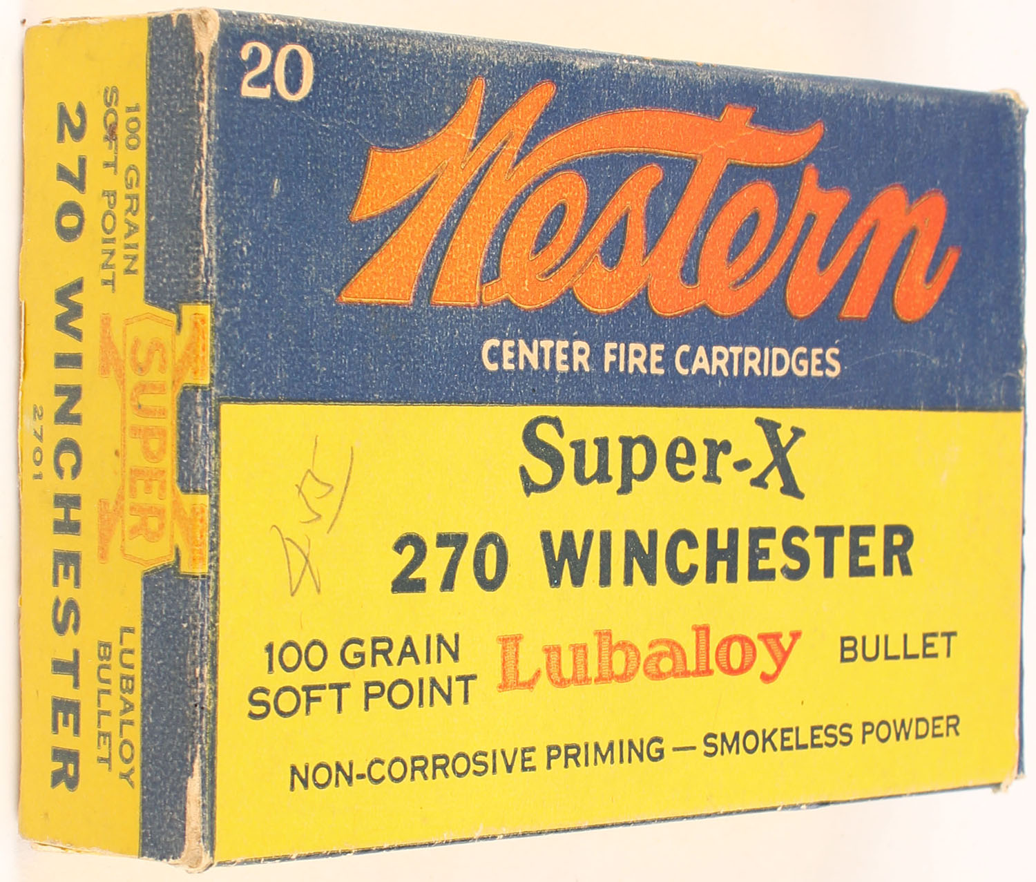 Western, Super-X, .270 Winchester, 100 Grain Soft Point Lubaloy Bullet, Full, 1pc. Yellow blue & red box, box is solid with very good to excellent color, minor color fading, some corner wear, minor edge wear, top has been written on, end flaps are solid, ammo is excellent. Grade: Very Good ++ - Value: 24 to 36