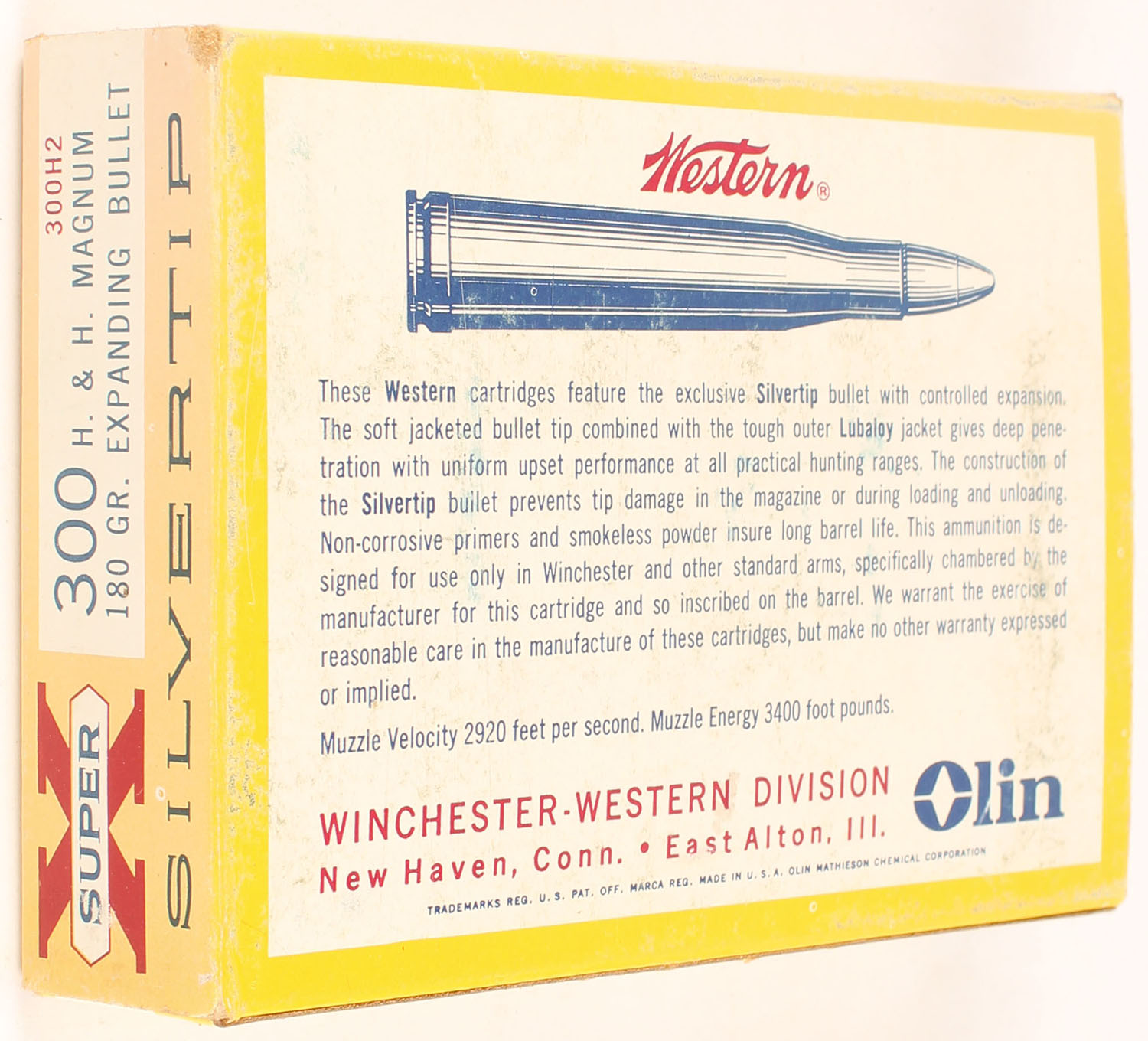 Western, Super X Silvertip, .300 H&H Magnum, 180 Grain Expanding Bullet, Full, 1pc. Yellow white & red box, box is solid with good color, color fading on top, minor corner wear, edges are mostly crisp, end flaps are solid, ammo is excellent to minty. Grade: Very Good - Value: 80 to 120