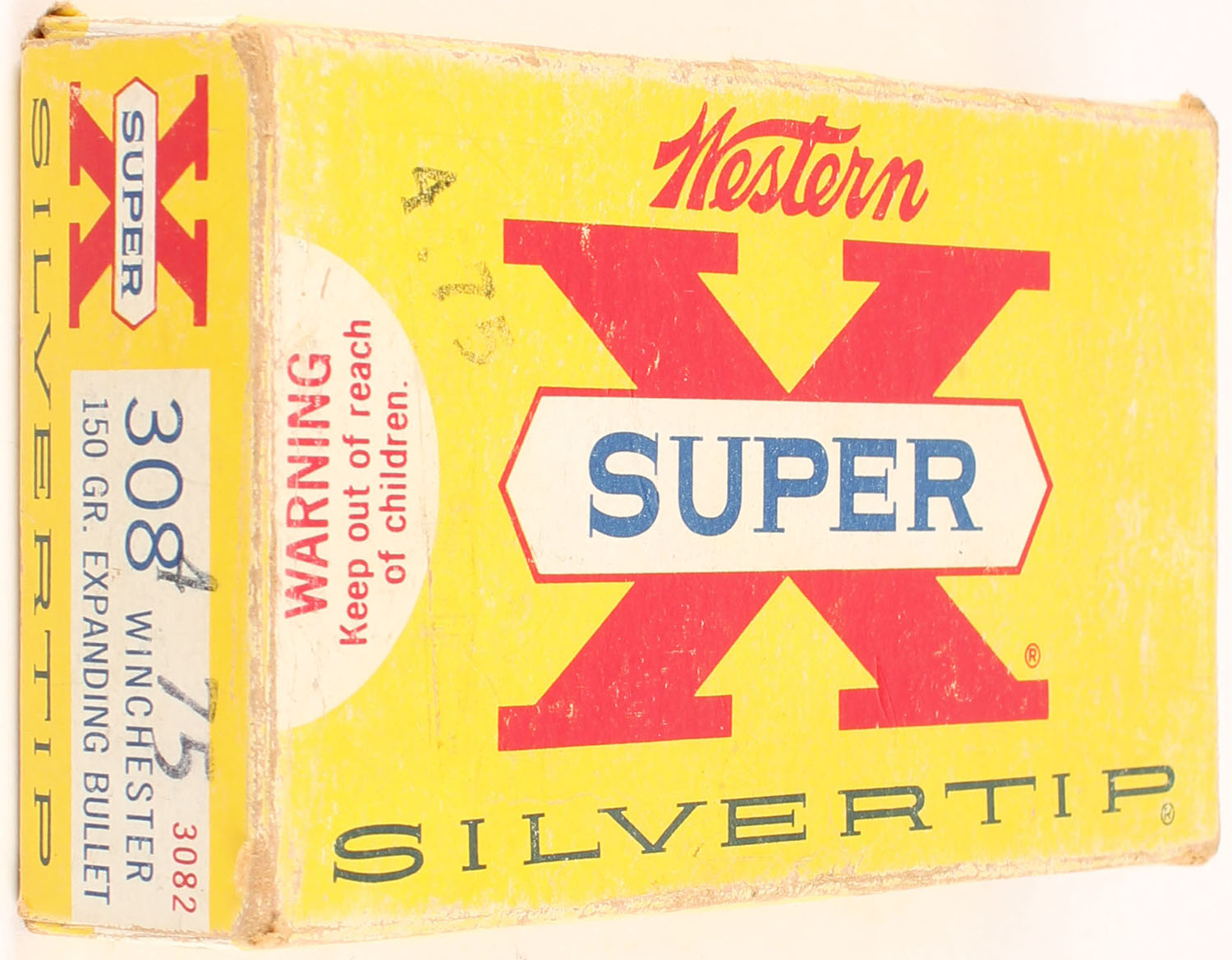 Western, Super X Silvertip, .308 Winchester, 150 Grain Expanding Bullet, Full, 1pc. Yellow white & red box, box is solid with excellent color, some edge & corner wear, end flaps are solid, ammo is excellent. Grade: Excellent - Value: 24 to 36