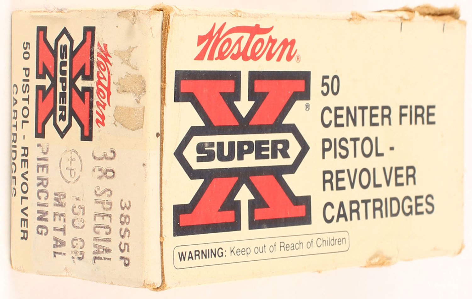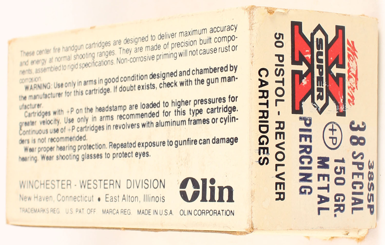 Western, Super X, .38 Special +P, 150 Grain Metal Piercing, Full, 1pc. White red & black box, box is solid with very good to excellent color, minor age soiling, some edge & corner wear, end flaps are solid, ammo is minty. Grade: Very Good ++ - Value: 50 to 75