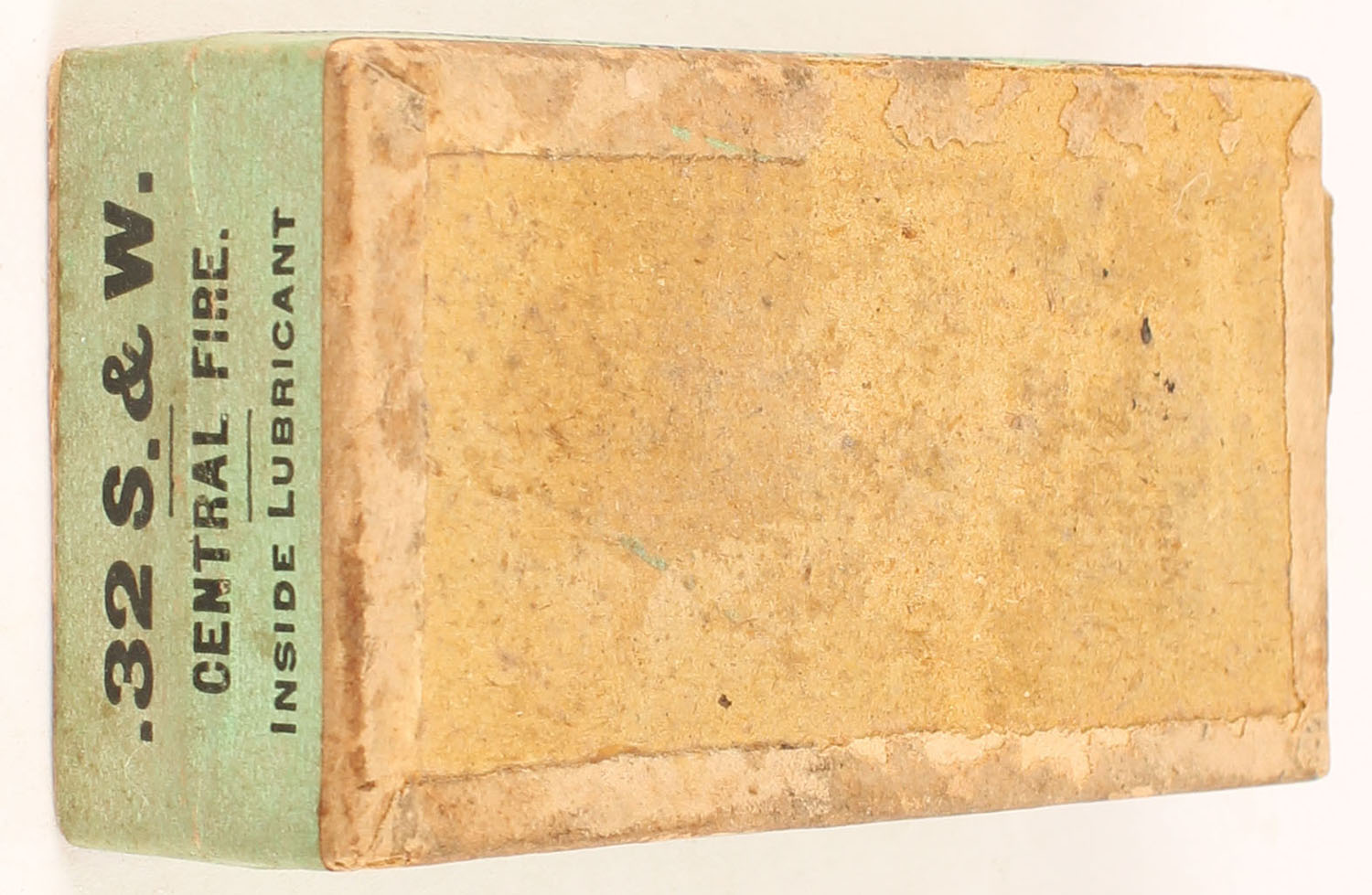Peters, Central-Fire Cartridges, .32 Smith & Wesson, 88 Grain Solid Head Bullet, FULL & SEALED, 2pc. Buff box with green top & side sealing labels, box is solid with very good color, age soiling, some edge & corner wear, labels are intact. Grade: Very Good + - Value: 24 to 36