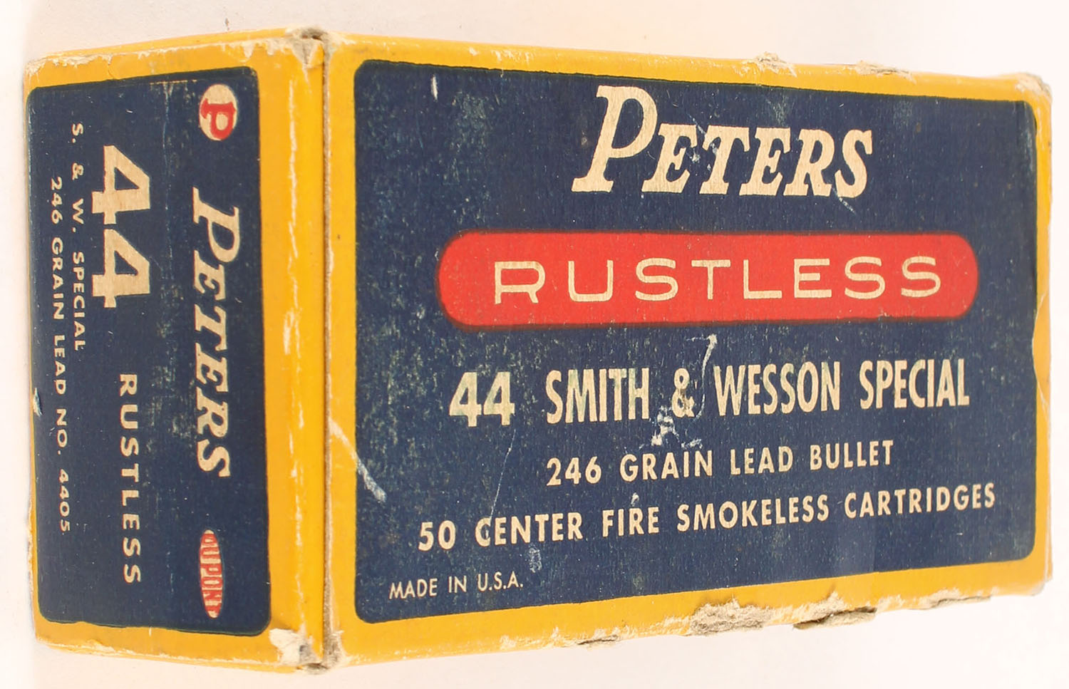 Peters, Rustless, .44 Smith & Wesson Special, 246 Grain Lead Bullet, Full, 1pc. Blue yellow & red box, box is solid with excellent color, minor shelf wear, some edge & corner wear, end flaps are solid, ammo is very good. Grade: Very Good ++ - Value: 40 to 60