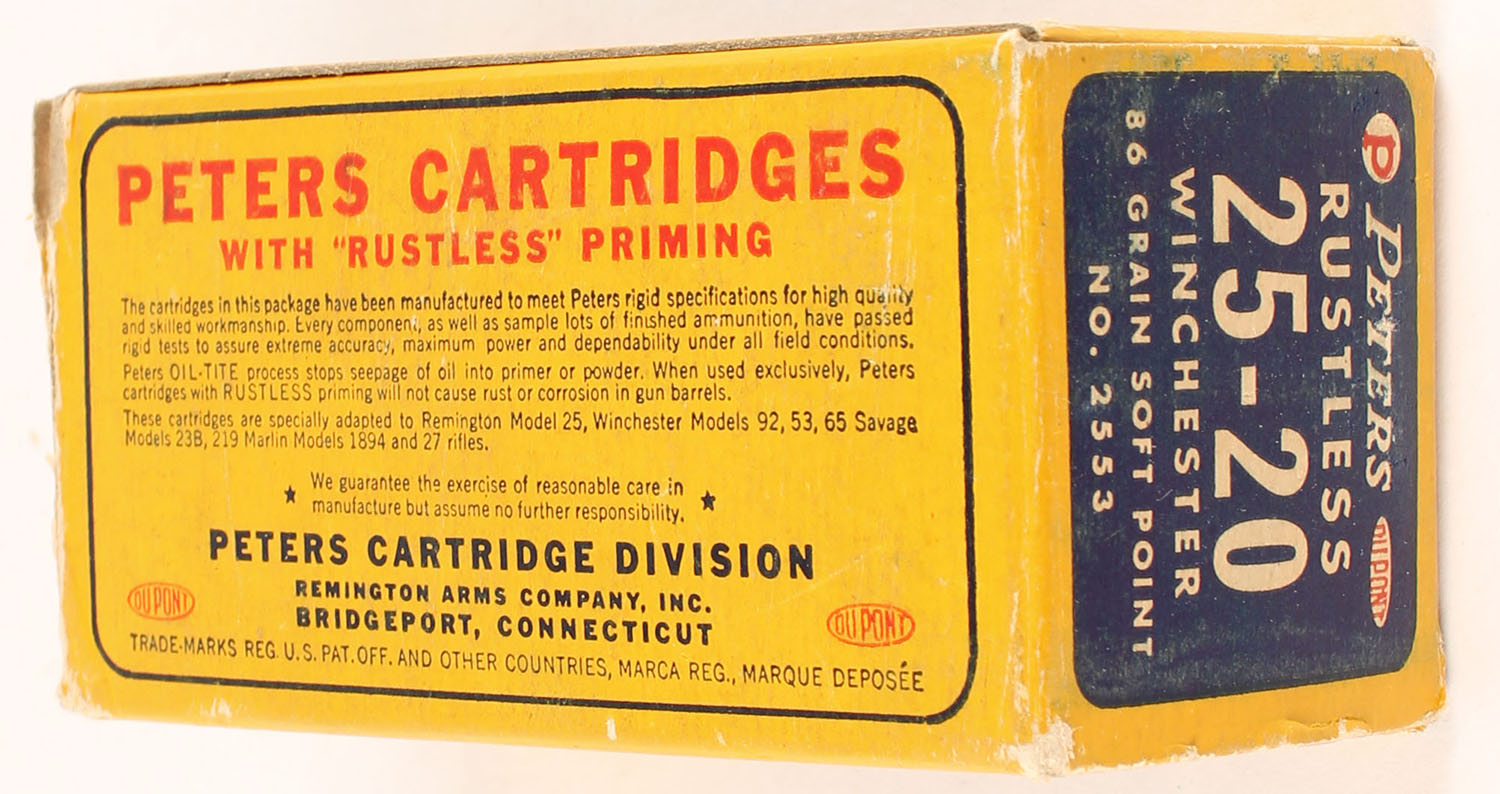Peters, Rustless, .25-20 Winchester, 86 Grain Soft Point Bullet, Full, 1pc. Blue yellow & red box, box is solid with excellent color, minor shelf & corner wear, edges are mostly crisp, end flaps are solid, ammo is excellent. Grade: Excellent - Value: 120 to 180