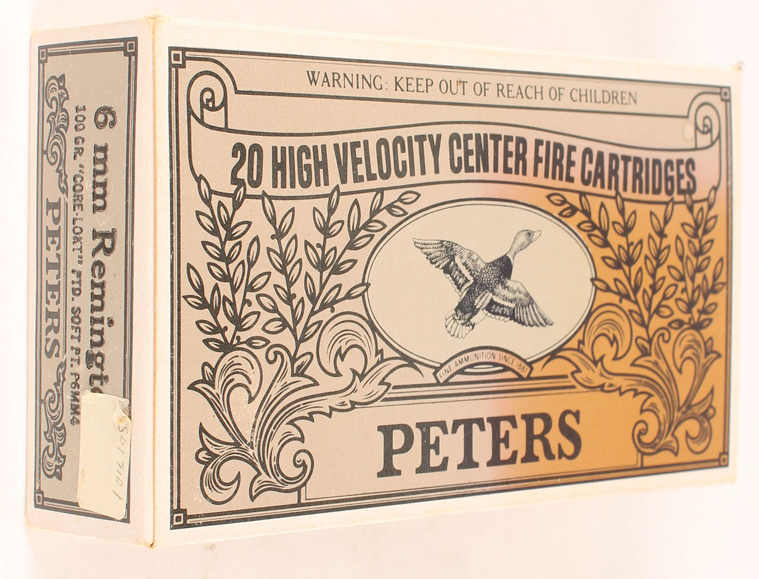 Peters, High Velocity Center Fire Cartridges, 6mm Remington, 100 Grain Core-Lokt Pointed Soft Point, Full, 1pc. Blown & black box, box is solid with very good color, color fading, corners are mostly sharp, edges are mostly crisp, end flaps are solid, ammo is excellent. Grade: Very Good ++ - Value: 40 to 60