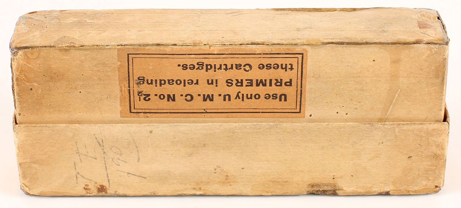 UMC, Central Fire Cartridges, .45-75 Winchester, 350 Grs. Bullet, Full, 2pc. Buff box with green label, box is solid with good to very good color, age soiling, some color fading & shelf wear, some edge & corner wear, label is intact, ammo is very good to excellent. Grade: Very Good ++ - Value: 160 to 240