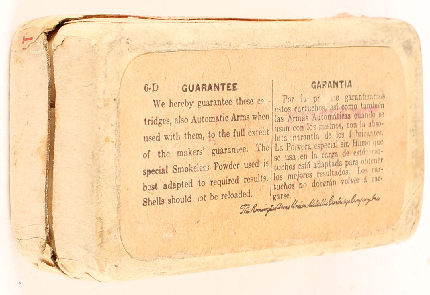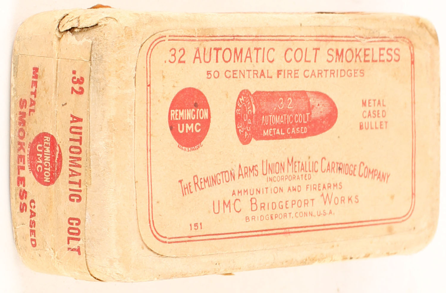 REM-UMC, Central Fire Cartridges, .32 Automatic Colt, Metal Cased Bullet, Smokeless, Full, 2pc. Buff box with buff top & side sealing labels, box is solid with excellent color, minor edge & corner wear, side sealing label is 85% intact, ammo is very good. Grade: Very Good ++ - Value: 40 to 60