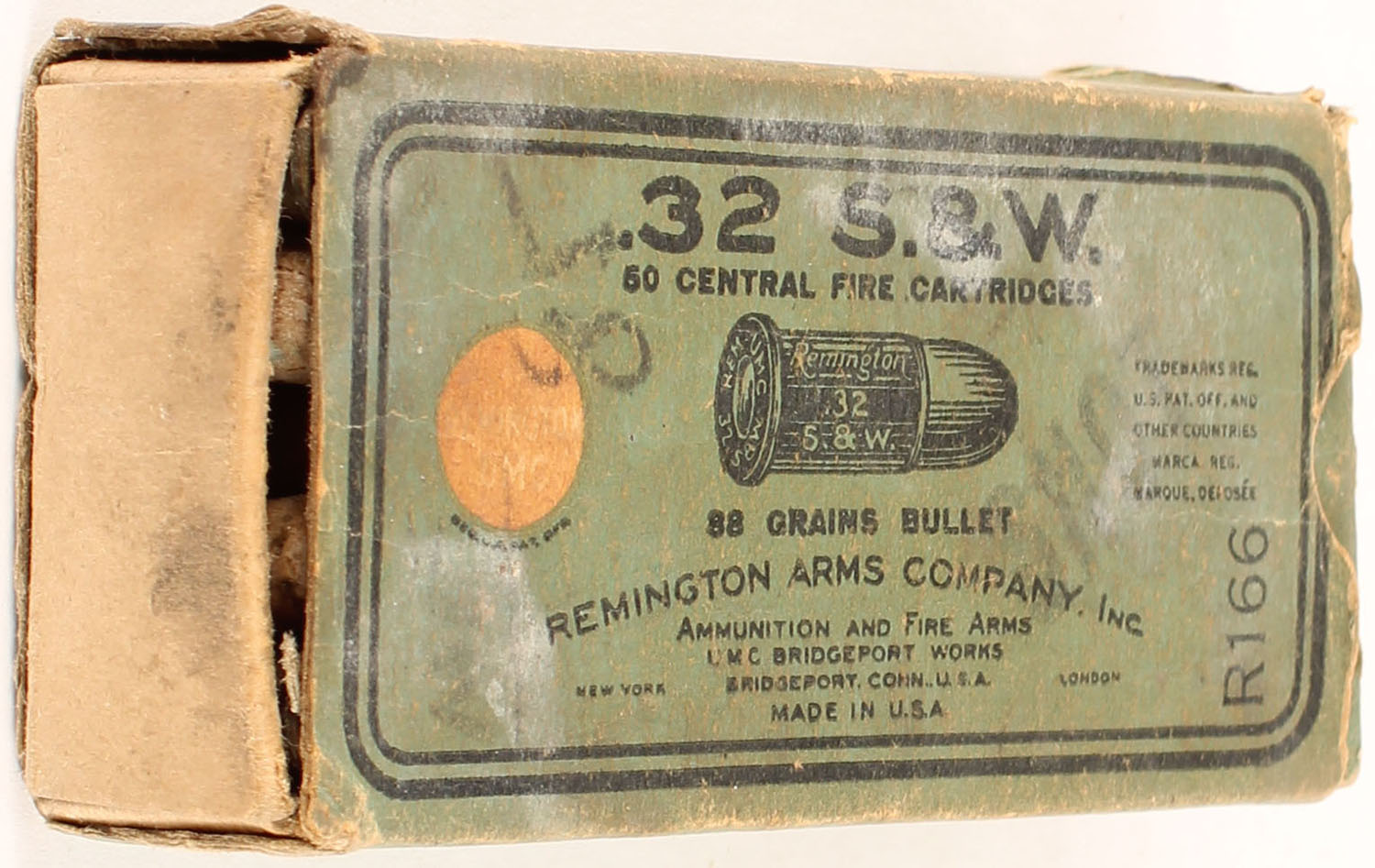 REM-UMC, Central Fire Cartridges, .32 Smith & Wesson Shot, Full, 1pc. Blue box with ''SHOT'' over-stamp, missing left end flap, good color, age soiling, some color fading, some edge & corner wear, right end flap is solid, ammo is good to very good. Grade: Good + - Value: 16 to 24