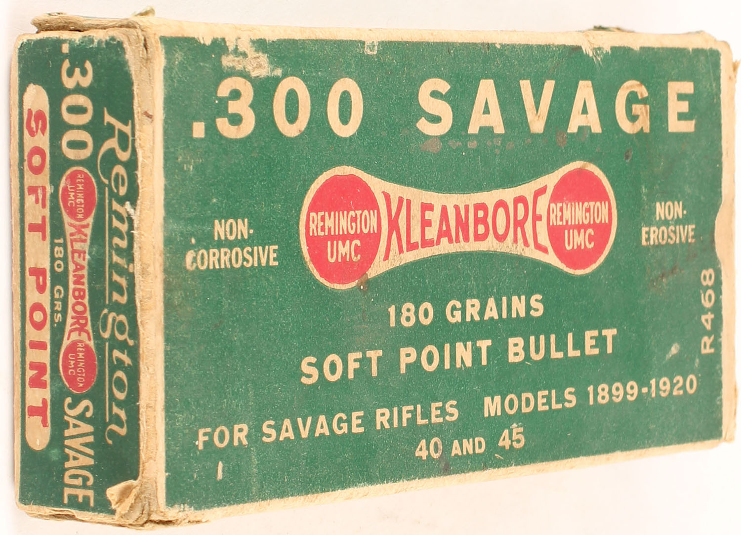 Remington, Kleanbore, .300 Savage, 180 Grains Soft Point Bullet, Full of mixed ammo, 1pc. Green buff & red dog bone box, box is solid with very good color, some age soiling, corner wear, very minor edge wear, end flaps are solid, ammo is very good. Grade: Very Good + - Value: 24 to 36