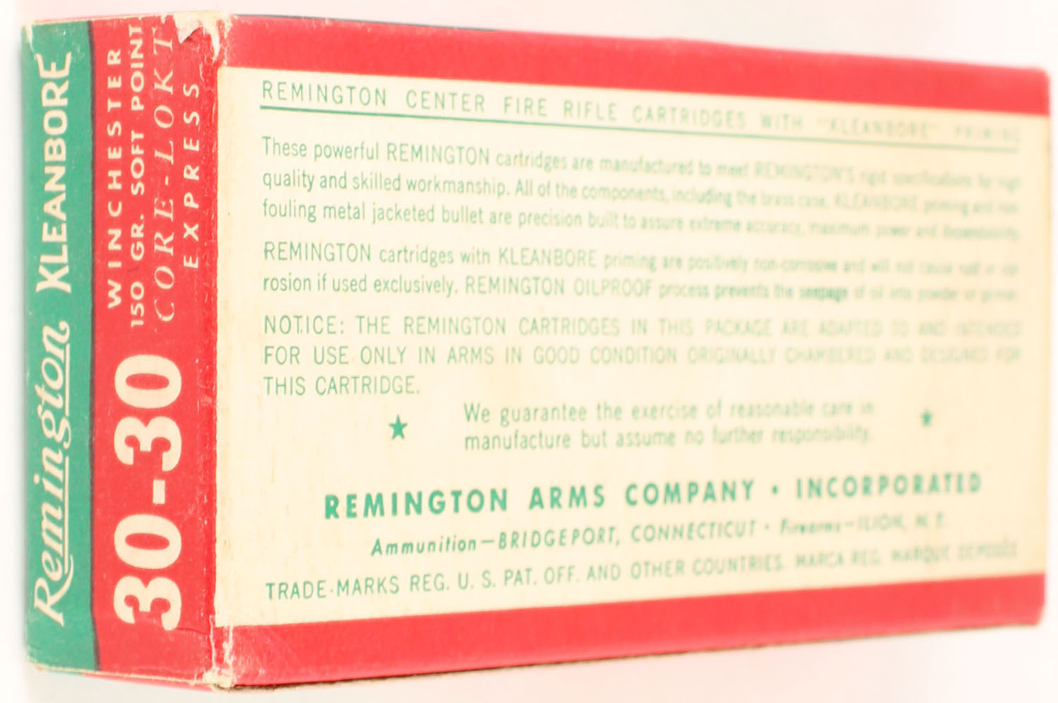 Remington, Kleanbore Express, .30-30 Winchester Express, 150 Grain Soft Point Core-Lokt Bullet, Full, 1pc. Green white & red box, box is solid with excellent color, very minor shelf & corner wear, edges are crisp, end flaps are solid, ammo is excellent. Grade: Excellent + - Value: 24 to 36