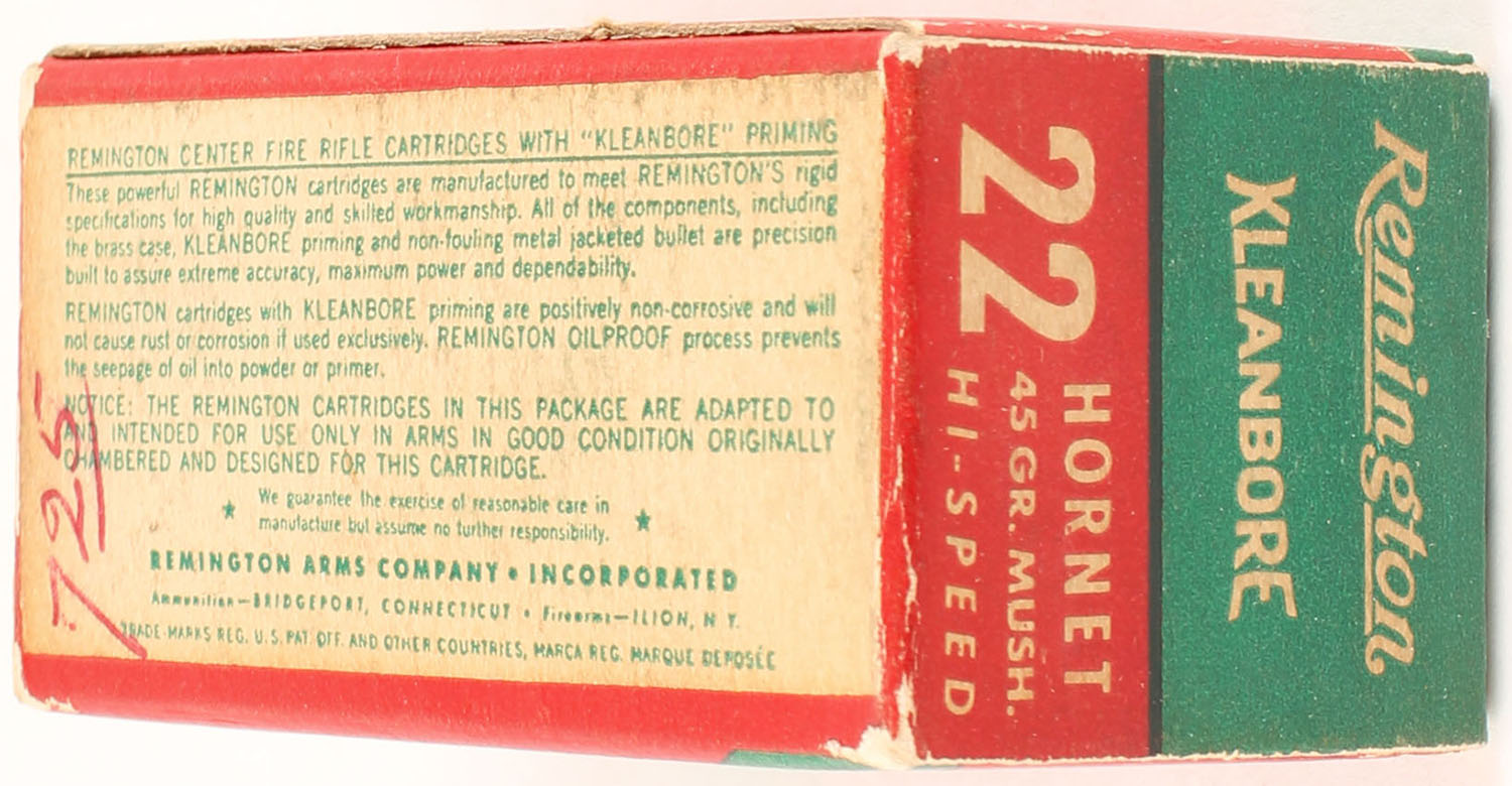 Remington, Kleanbore Hi-Speed, .22 Hornet, 45 Grain Hollow Point Bullet, Full, 1pc. Green red & buff box, box is solid with excellent color, very minor age soiling & corner wear, edges are crisp, end flaps are solid, ammo is excellent. Grade: Excellent + - Value: 70 to 100