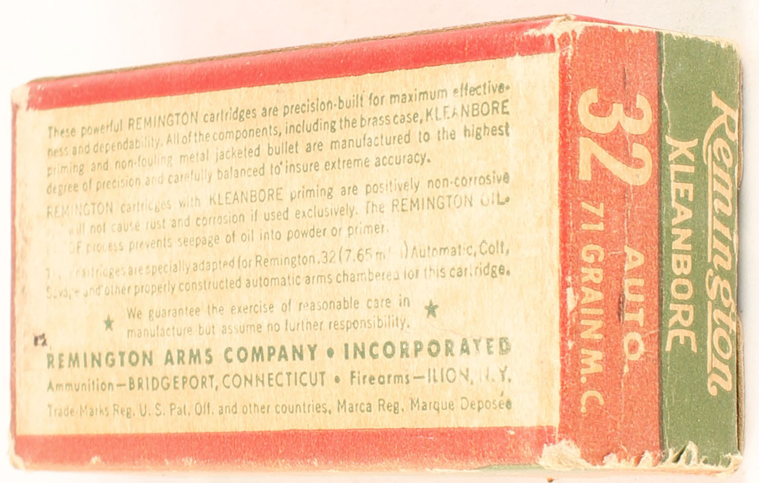 Remington, Kleanbore, .32 Automatic, 71 Grain Metal Case Bullet, Full, 1pc. Green buff & red box, box is solid with good color, color fading, minor shelf wear, some edge & corner wear, end flaps are solid, ammo is excellent. Grade: Very Good - Value: 24 to 36