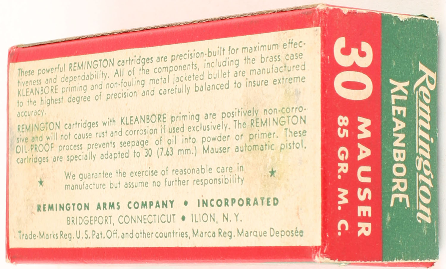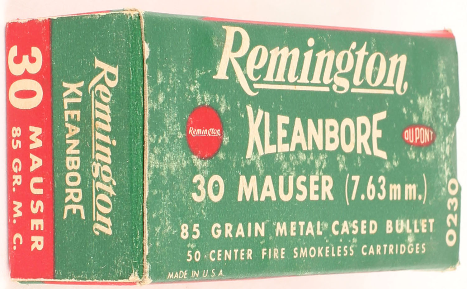 Remington, Kleanbore, .30 Mauser (7.63mm), 85 Grain Metal Cased Bullet, Full, 1pc. Green white & red box, box is solid with excellent color, some shelf & corner wear, edges are crisp, end flaps are solid, ammo is excellent to minty. Grade: Excellent - Value: 24 to 36