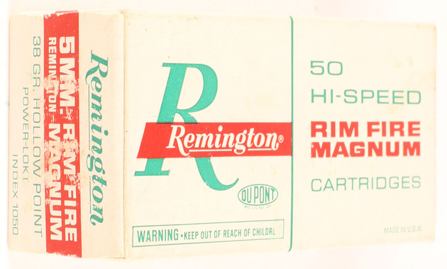Remington, Hi-Speed, 5mm Remington Rim Fire Magnum, 38 Grain Hollow Point Power-Lokt, Full, 1pc. White red & green box, box is very solid with excellent colors, corners are mostly sharp, end flaps are solid, ammo is minty. Grade: Excellent + - Value: 60 to 90