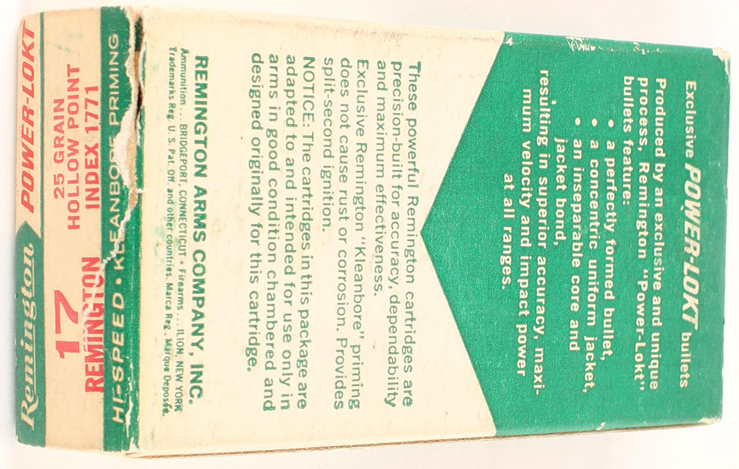 Remington, Power-Lokt, .17 Remington, 25 Grain Hollow Point, Full with 1rd. being fired, 1pc. White green & red box, box has light age soiling with good color, has partially torn right end flap, ammo is excellent. Grade: Very Good ++ - Value: 50 to 75