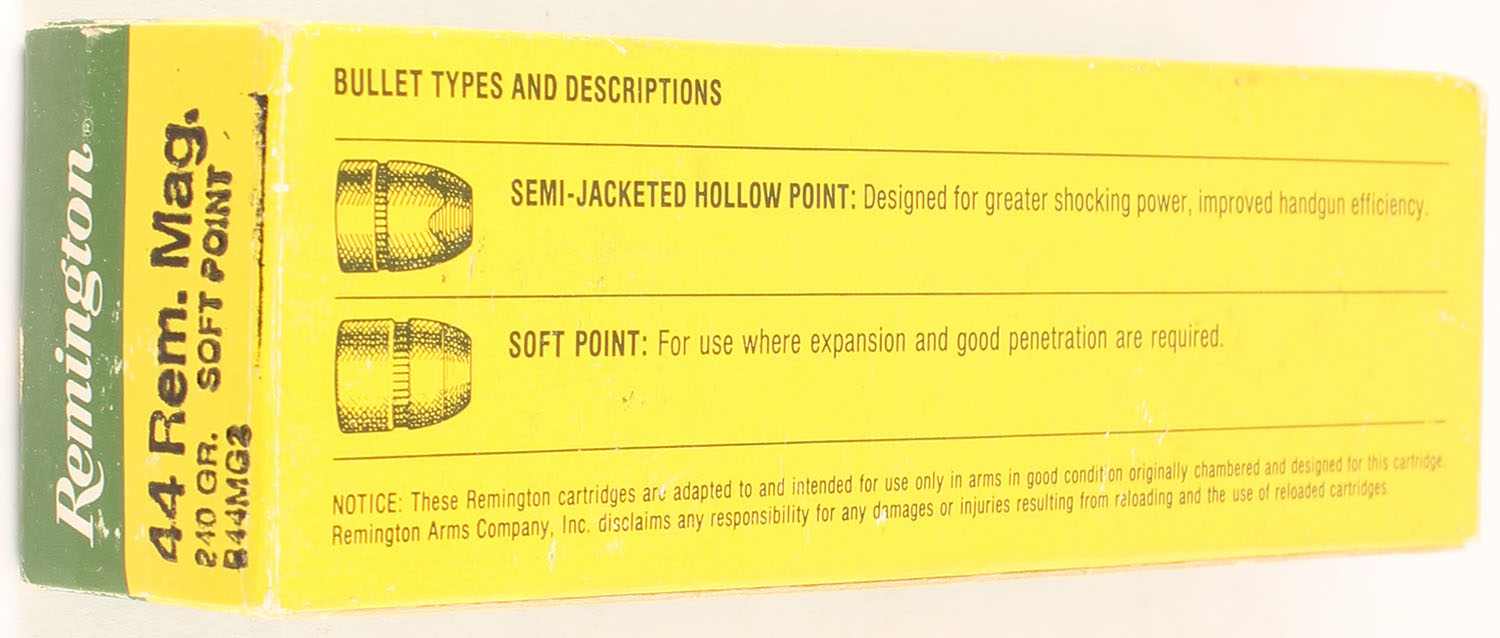 Remington, High Velocity, .44 Rem. Mag., 240 Gr. Soft Point, 1pc, Full, Green & yellow box with white/black print, box is solid with light scuffing & sticker to top, end flaps are solid, ammo is excellent. Grade: Excellent - Value: 24 to 36