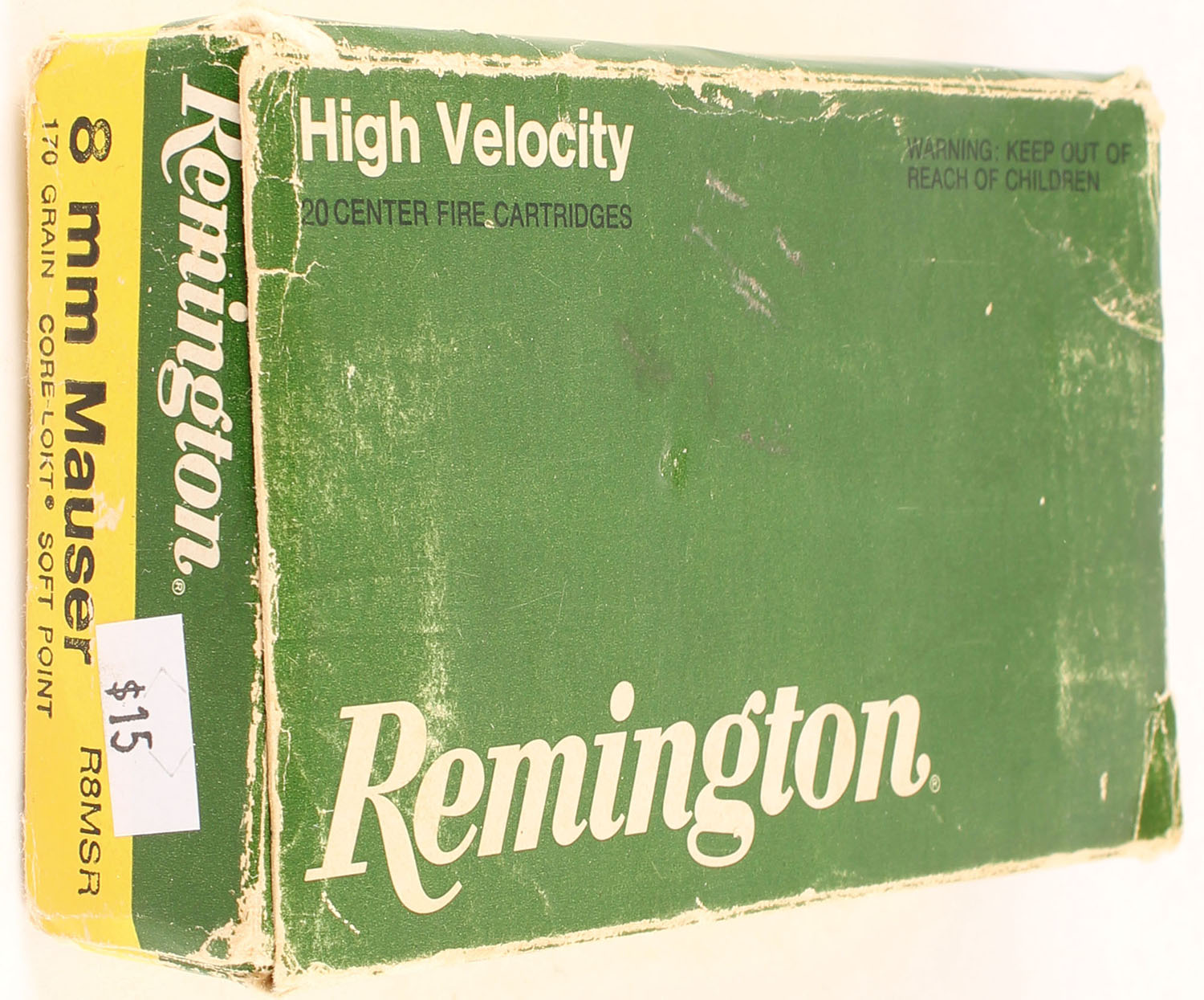 Remington, High Velocity, 8 mm Mauser, 170 Grain Core-Lokt Soft Point, Partial 18rds., 1pc., Green & yellow box, box has edge & corner wear with some age soiling, ammo is very good. Grade: Good ++ - Value: 16 to 24