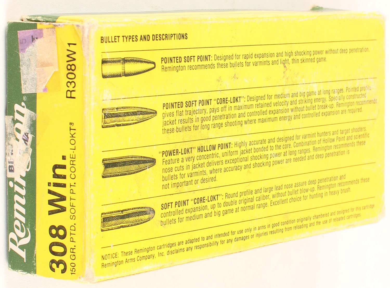 Remington, High Velocity, .308 Winchester, 150 Grain Pointed Soft Pt. Core-Lokt, Full, 1pc. Green yellow & white box, box has age soiling with edge & corner wear, end flaps are solid, ammo is excellent. Grade: Very Good ++ - Value: 20 to 30