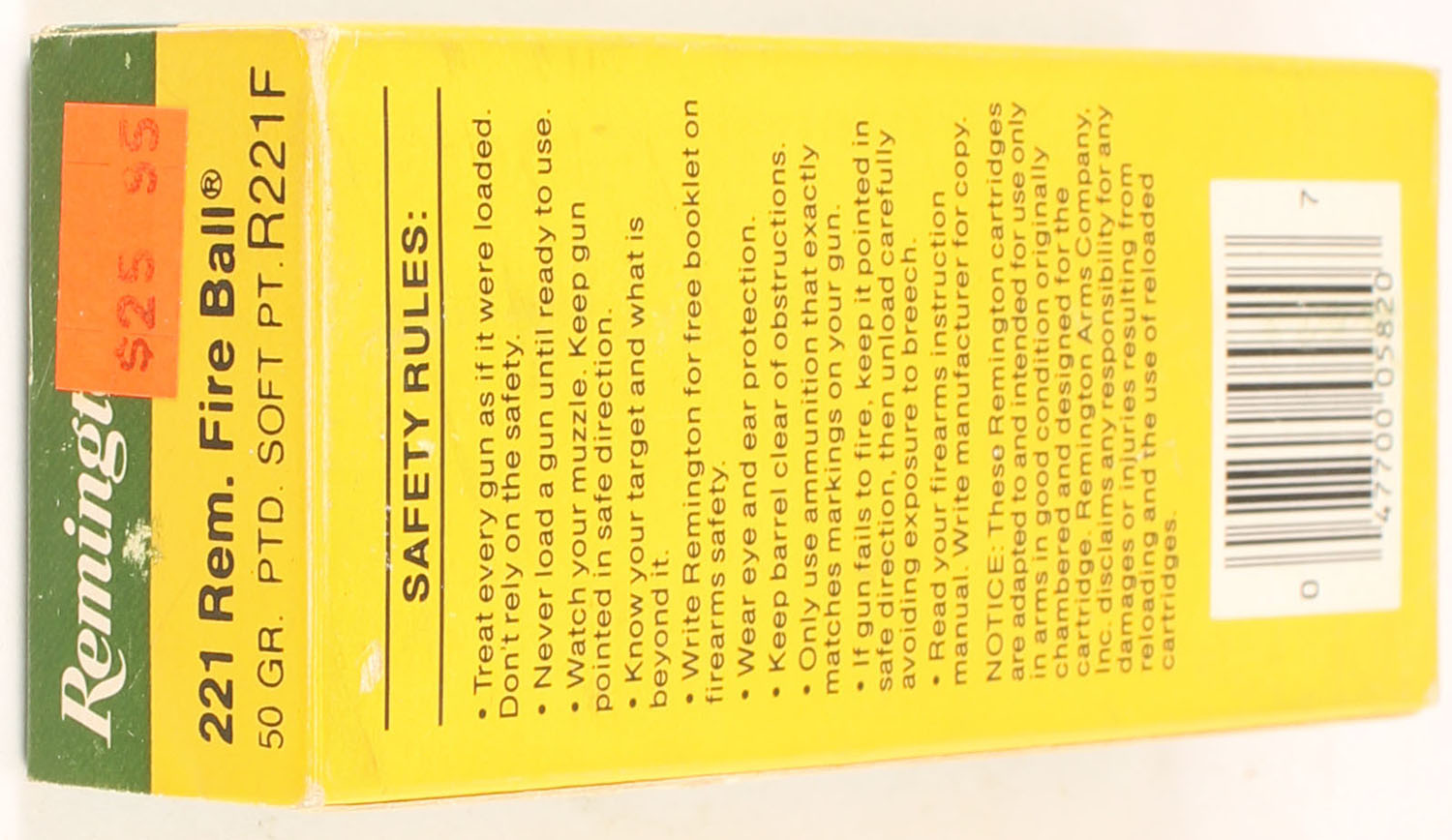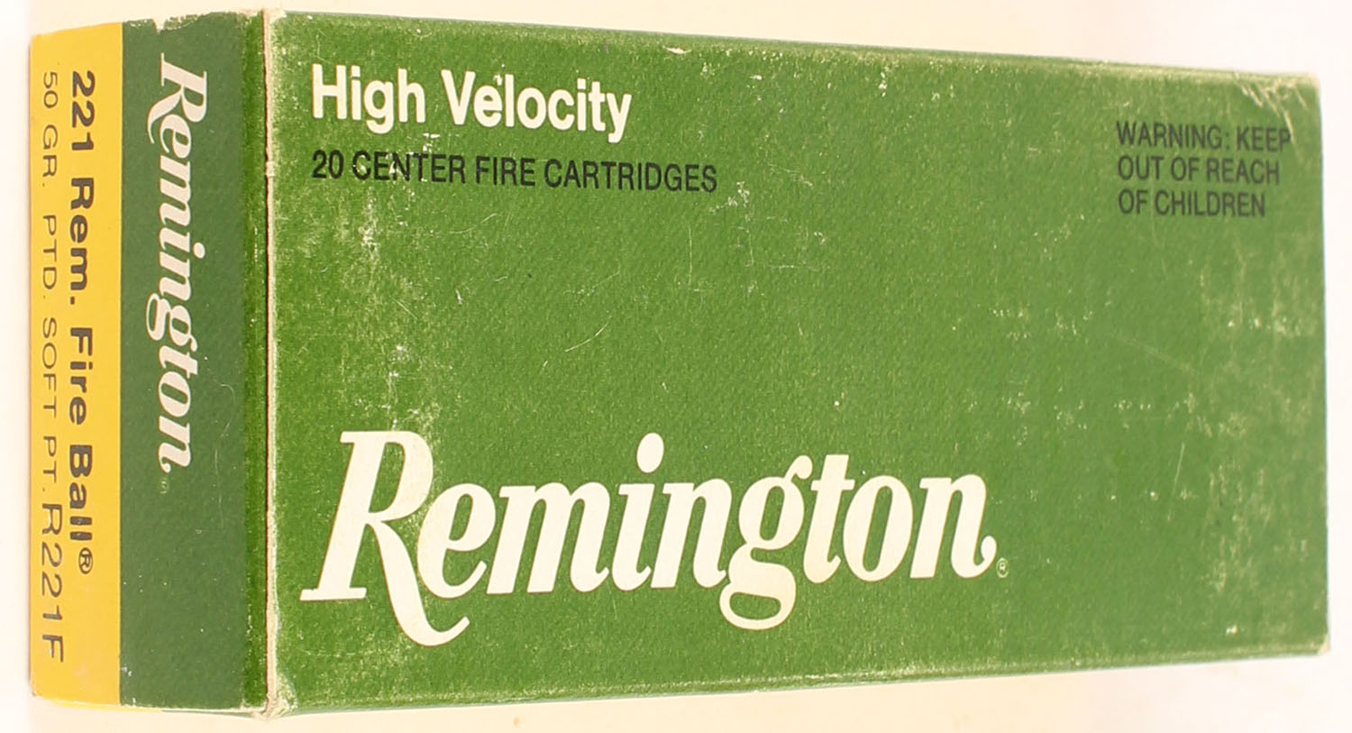 Remington, High Velocity, 221 Rem Fire Ball, 50 Grain Pointed Soft Point, Full, 1pc. Yellow, green, white & black box, box is very solid with light rub marks, end flaps are solid, ammo is excellent. Grade: Very Good ++ - Value: 30 to 45