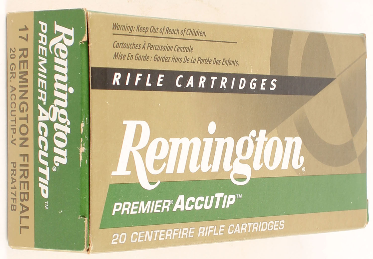 Remington, Premier AccuTip, .17 Remington Fireball, 20 Grain Accutip-V, multi-colored box, box is very solid, edges are crisp, end flaps are solid, ammo is excellent. Grade: Excellent ++ - Value: 40 to 60