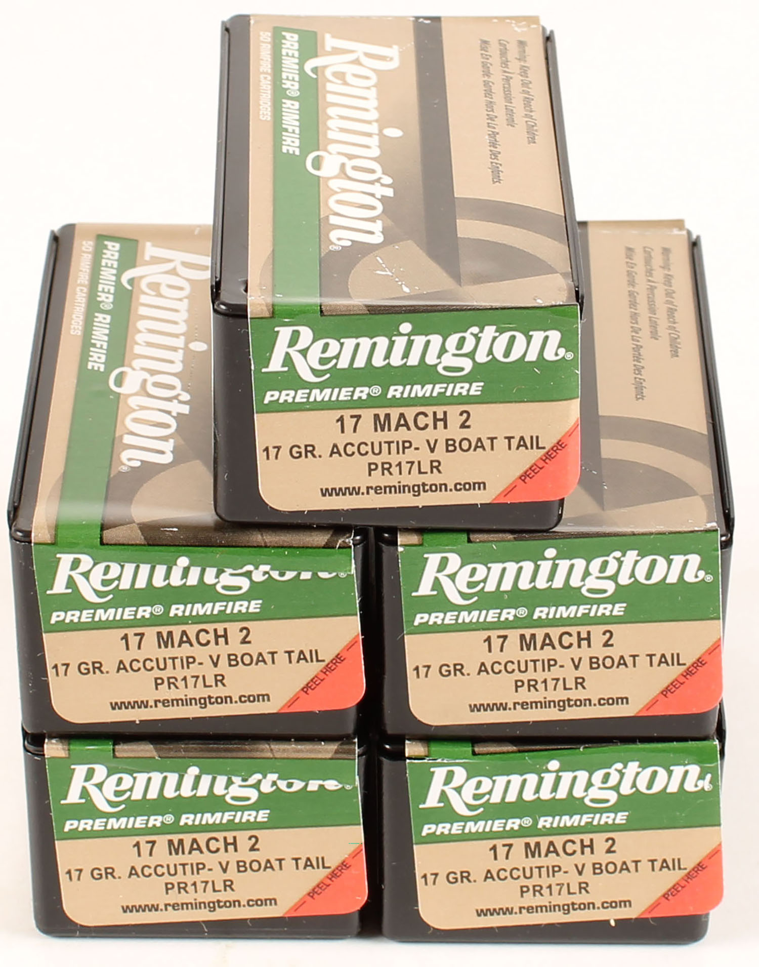 Remington, Lot of (5), Premier Rimfire, 17 Mach 2, 17 Grain AccuTip-V Boat Tail, FULL & SEALED, 1pc. Gold, green, white & black boxes, boxes are solid with very nice color. Grade: Excellent - Value: 50 to 75