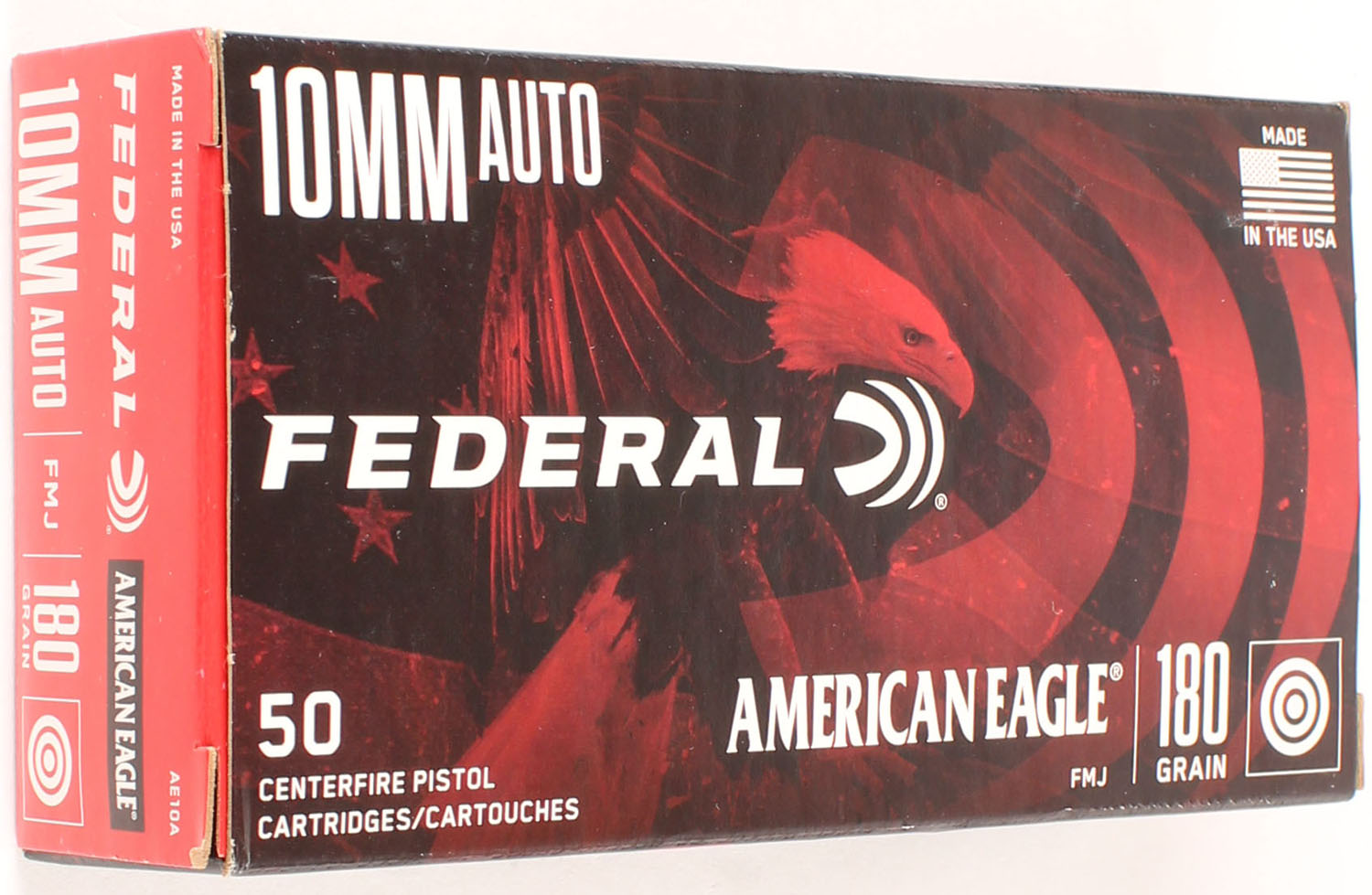 Federal, American Eagle, 10mm Auto, 180 Grain FMJ, Full, 1pc. Multi-colored box, box is solid with great color, end flaps are solid, ammo is excellent. Grade: MINT - Value: 24 to 36