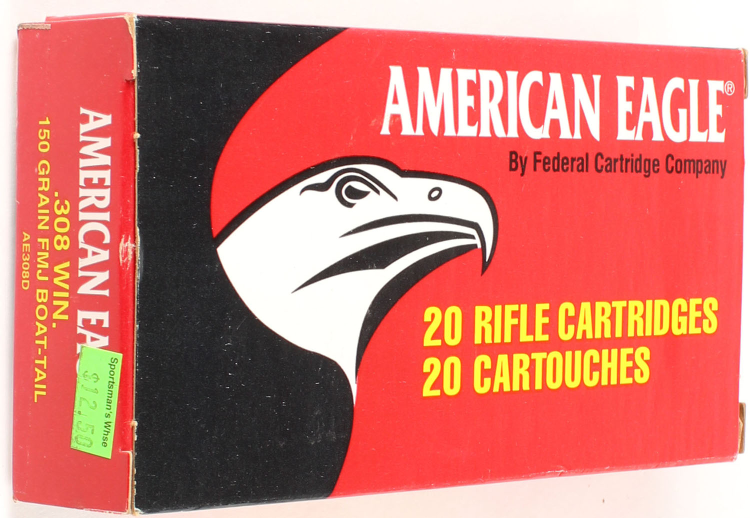 American Eagle, 308 Win, 150 Grain FMJ Boat Tail, Full, 1pc., multi-colored box, box is solid with excellent color, left end flap is torn, ammo is minty. Grade: Very Good ++ - Value: 16 to 24