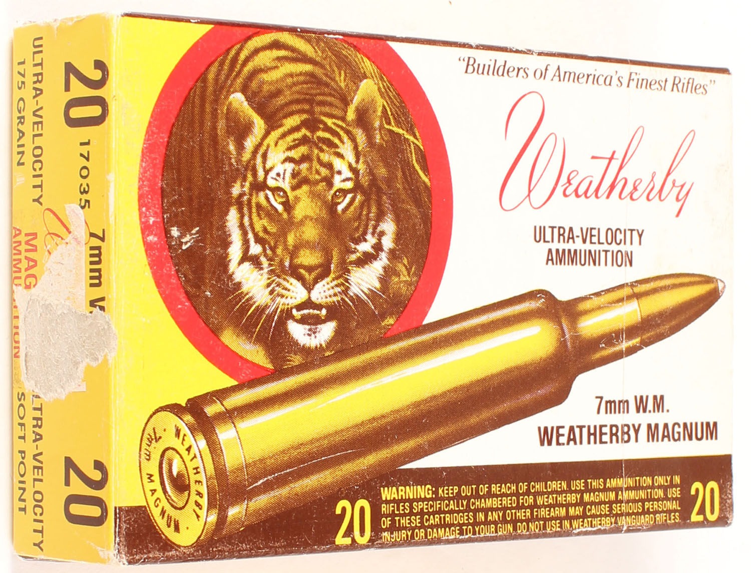 Weatherby, Ultra-Velocity Ammunition, 7mm Weatherby Magnum, 175 Grain Soft Point, Full, 1pc. Multi-colored tiger box, box is solid with excellent color, minor edge & corner wear, end flaps are solid, ammo is excellent. Grade: Excellent + - Value: 40 to 60