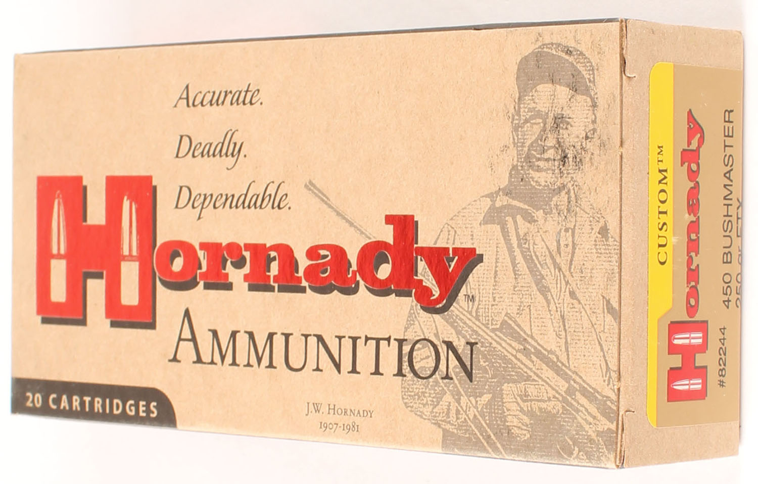 Hornady, Custom, 450 Bushmaster, 250 Grain FTX, Full, 1pc. multi-colored box, box is solid with excellent color, Ammo is excellent. Grade: Excellent ++ - Value: 30 to 45